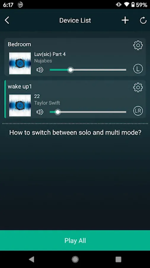 - Uses Android device's rocker volume control to control the selected room's volume.