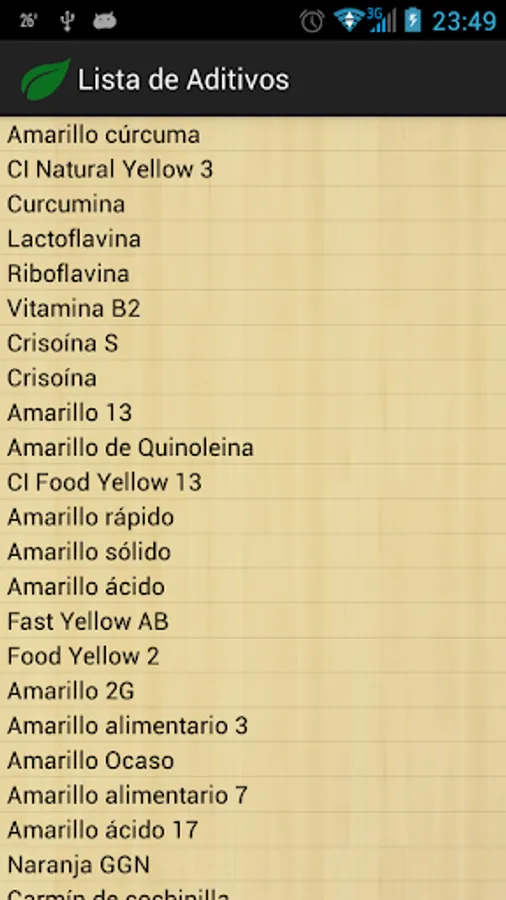 With this application you can search more than 200 food additives (dyes, acids, preservatives, etc.)