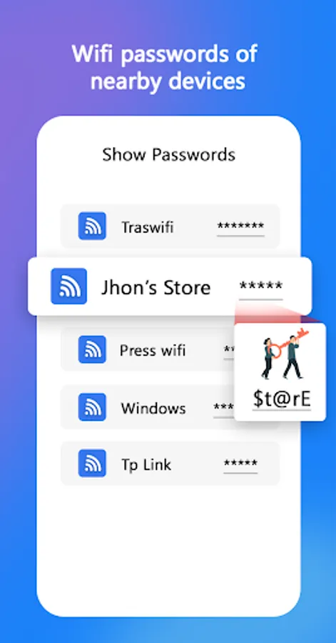 WIFI password master key show: wifi manager allows you to see saved wifi passwords without root. You can view all wifi passwords in the app which you already saved. It is the wifi password saver app because when you connect with any wifi network using this wifi key finder - show wifi password no root app, you can discover all nearby wifi networks by clicking on wifi networks button in this wifi master key - get wifi password app. You can get free wifi password using this wifi key without root β keymaster app because it is a free wifi password show app, you donβt have to pay anything to view saved wifi passwords. If you want to check your wifi ip address then you can also do this by wifi real master key - wifi password finder app. Want a strong password for your mobile hotspot? We are providing you password generator by which you can make secure your mobile hotspot. QR Scan feature helps you to immediately connect with wifi by just scanning. Get master key with this wifi pass show app. Now you want to connect your laptop to the Wi-Fi network, but you forgot the password. In these silly situations like this, you can open your android mobiole and get the WiFi password to connect your new laptop to your WiFi network using this wifi manager: show wifi password without root app.