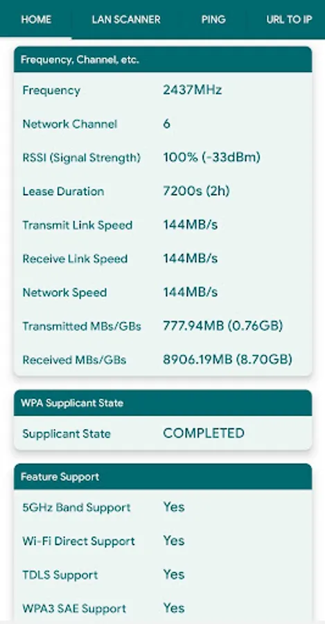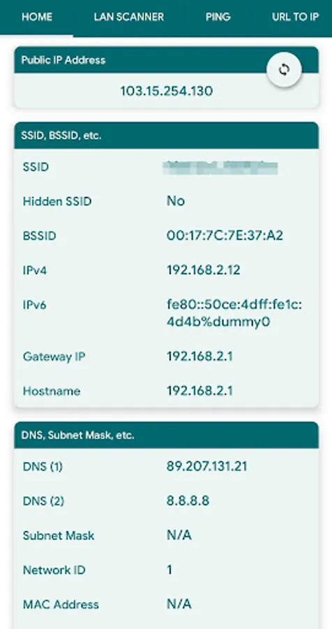 * Wireless N/W info (public ip address, ssid, bssid, IPv4, IPv6, gateway IP, DNS channel etc)