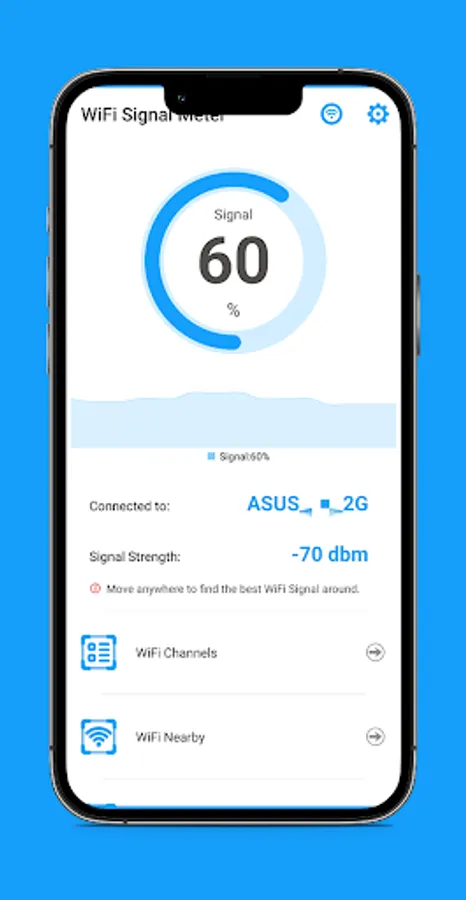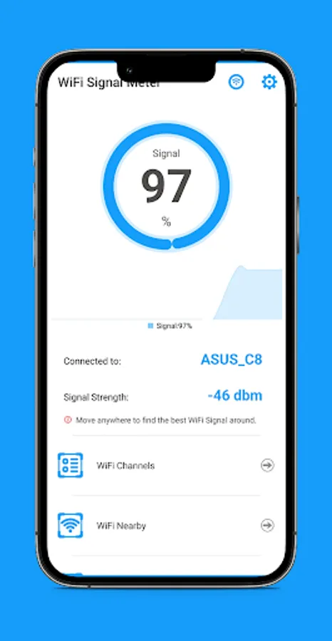 WiFi Signal Strength Meter can help you check current connected WiFi and WiFi Signal Strength. it can detect WiFi Signal Strength around you in real time. if you feel your network is slow, maybe the wifi signal strength is weak, and you can use the app to find better wifi signal strength around.