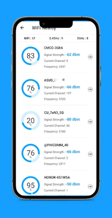 The app can find good areas of WiFi connectivity in your WiFi network place. When the WiFi signal strength is weak, switching to a good wifi or moving anywhere to find better wifi signal strength is a good choice. The app will update WiFi Signal Strength in real time, you can test wifi signal strength in order to find the better location.
