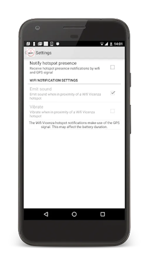 Memorizza le credenziali per accedere al servizio e permette di ricevere una notifica quando ci si trova nelle vicinanze di un punto d'accesso Vicenza WiFi.