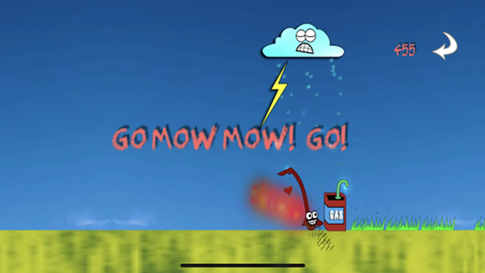 When Mow Mow is mowing grass you will see Mow Mow's heart grow strong. Once that little heart goes away you must avoid coins and other obstacles until you mow another patch of grass. Once you have strengthened Mow Mow's heart, collect the coins and blast through obstacles. You must be fast to constantly get to another patch of grass to keep Mow Mow's heart strong!
