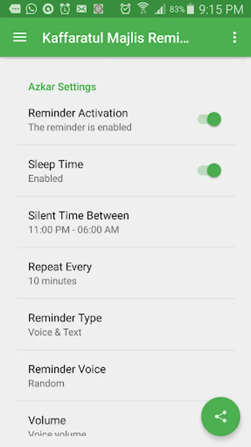 يمكن التحكم في صوت جميع الاذكار و انواعها كما يمكن تحديد فترة إيقاف المنبه عند فترة النوم والتي يحددها المستخدم