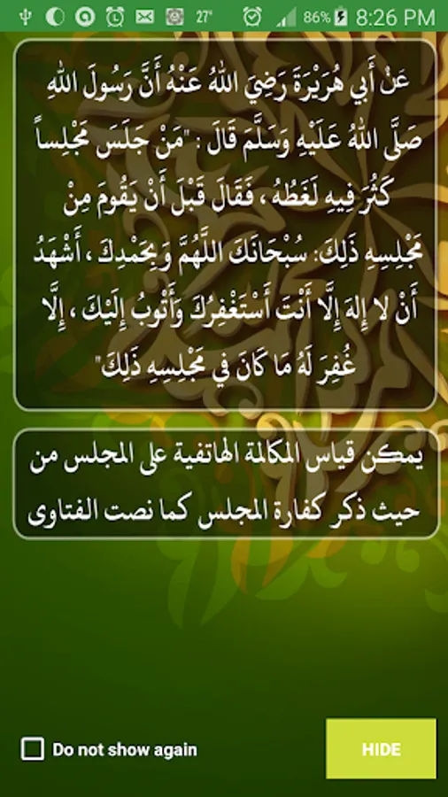 يقوم هذا التطبيق بتذكيرك بدعاء كفارة المجلس بعد انتهاء المكالمات الهاتفية. حيث يقوم التطبيق بقراءة الدعاء صوتا أو نصا أو كلاهما بعد انتهاء المكالمة.