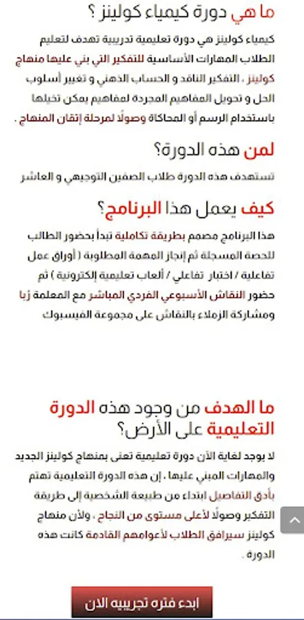 Collins Chemistry is an educational training course that aims to teach students the basic skills of thinking on which the Collins curriculum is built, critical thinking, mental arithmetic, changing the solution method, and transforming abstract concepts into concepts that can be imagined using drawing or simulation, up to the stage of mastering the curriculum.