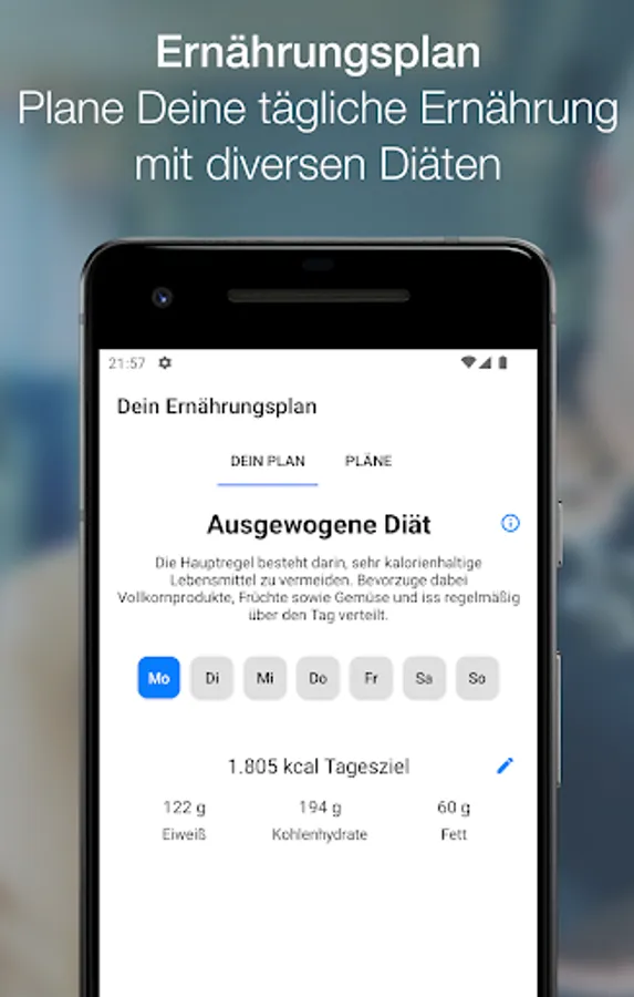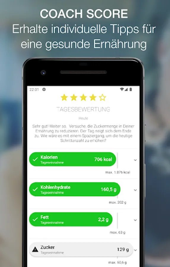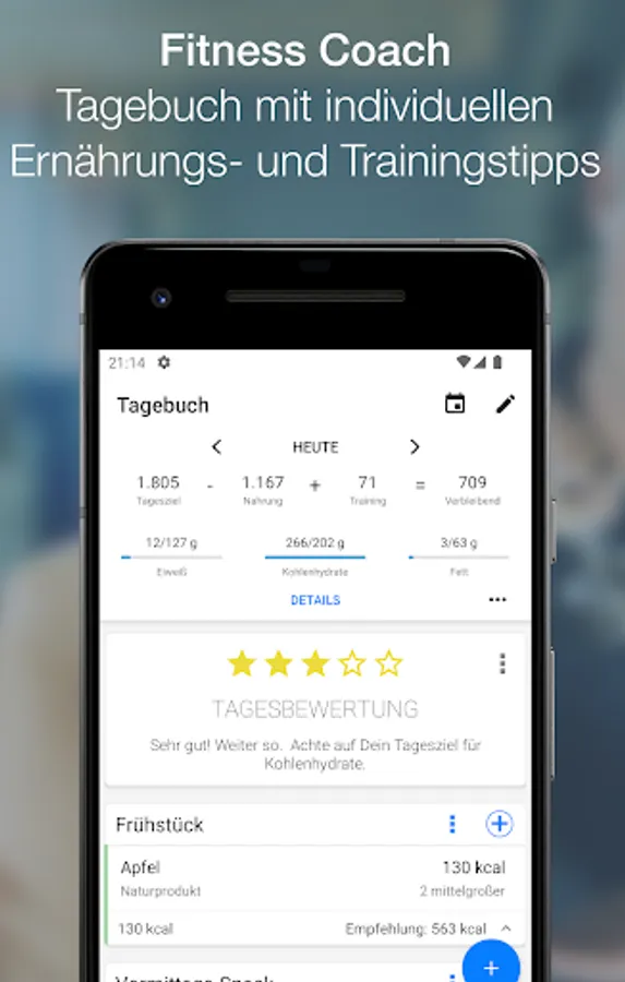 By using the calorie counter and diary the coach provides helpful tipps and suggestions for improvement. The food labeling makes it easy to see which food fits your diet goal.