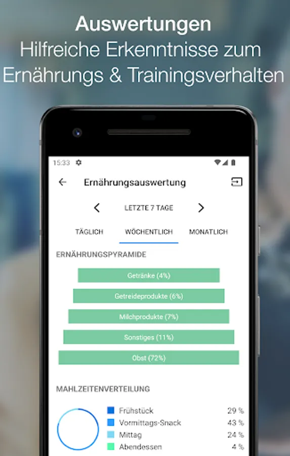 Furthermore, the COACH SCORE analyzes your daily and weekly diet and training results, e.g. see your foods having most calories or salt.