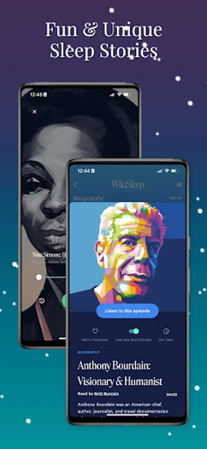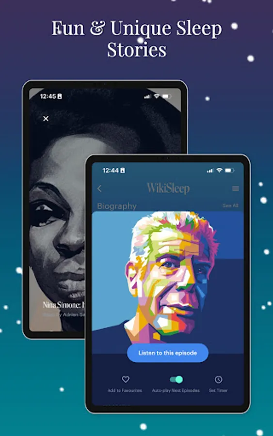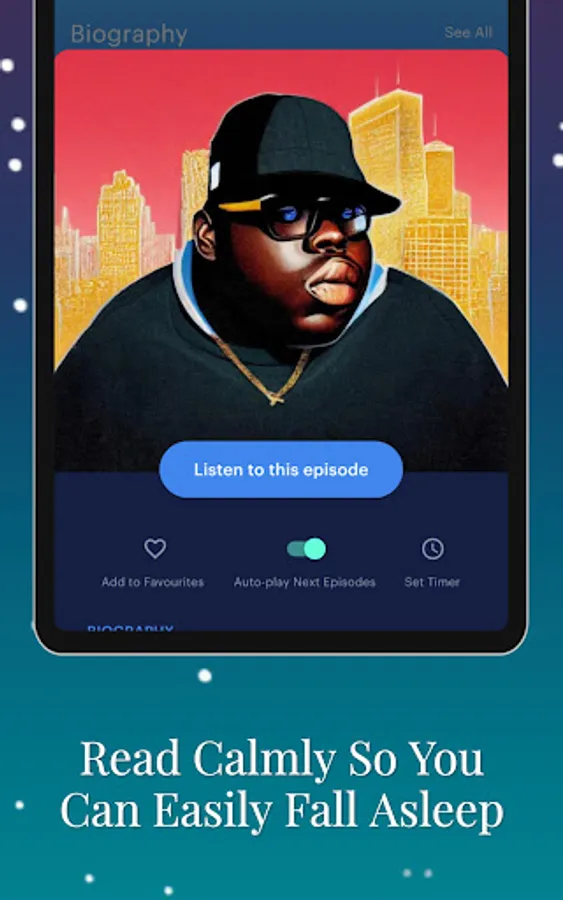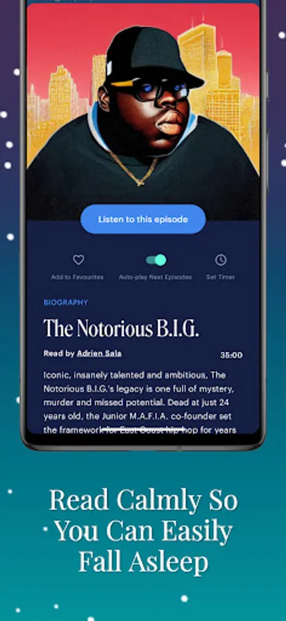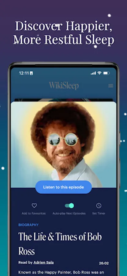 We offer stories that are unusual for sleep apps, such as biographies of fascinating people like The Notorious B.I.G., Marie Antoinette or Bob Ross—or weird histories of everyday things like wine or cameras. Regardless of the story, every episode is delivered in a calm and soothing way.