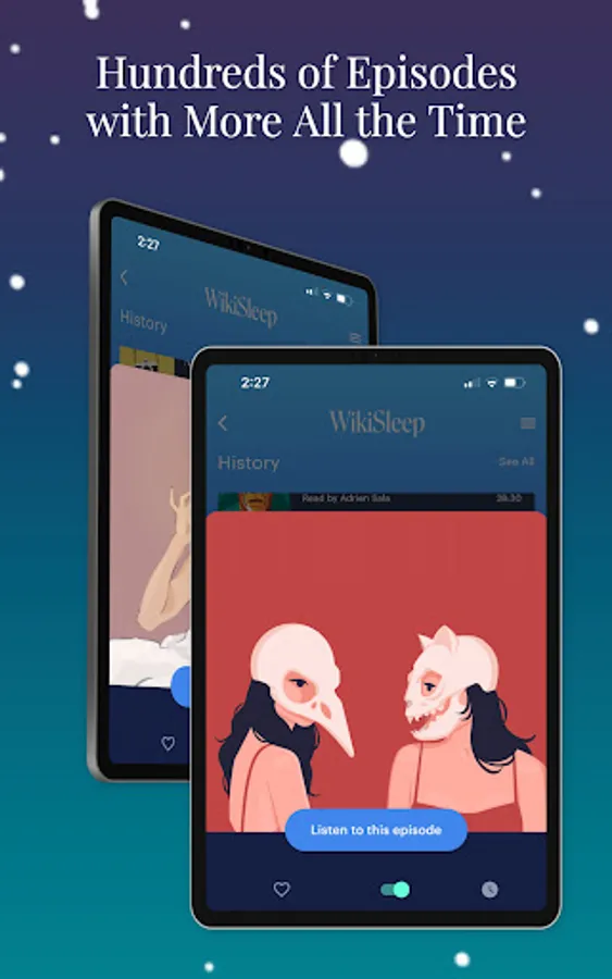Unlike many other sleep apps that rely heavily on tricks or deep meditation, WikiSleep works on the simple principle of diversion. The stories we provide are interesting enough to grab your attention—but calm enough that you can drift off while listening.