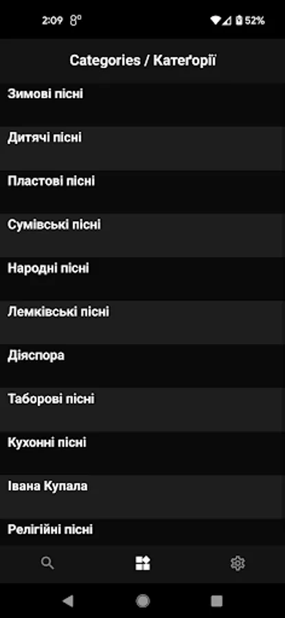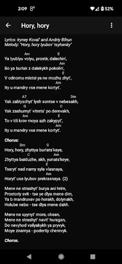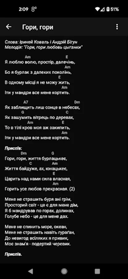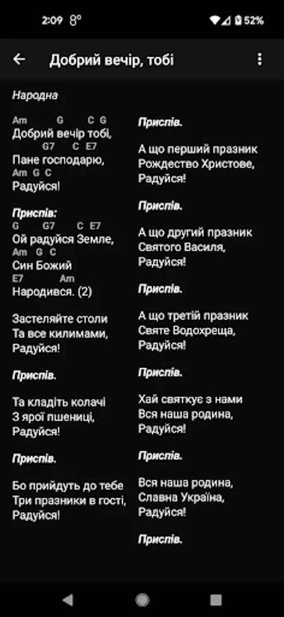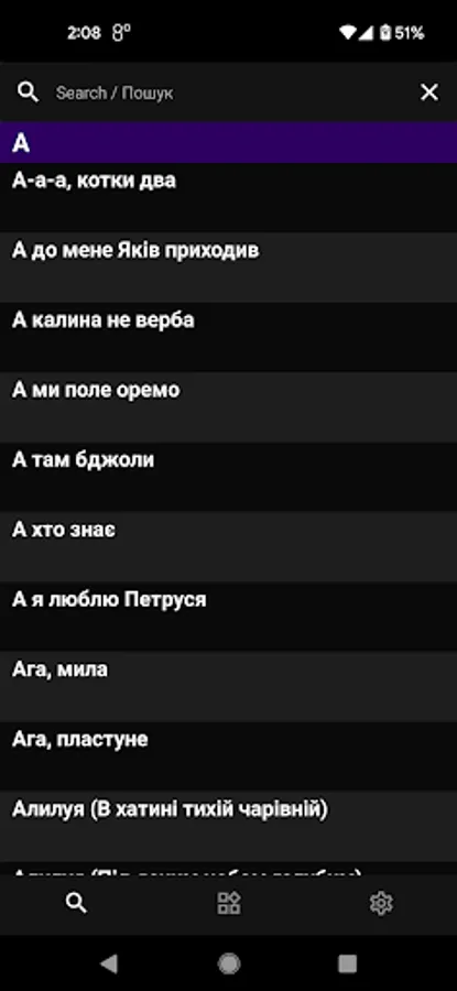 This app includes lyrics and guitar chords for hundreds of songs, works offline, has a dark mode, and transposes chords into any key! It is the most comprehensive digital collection of Ukrainian zabava, Plast, CYM, and other diasporic music!