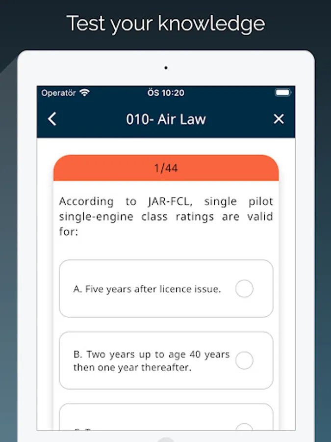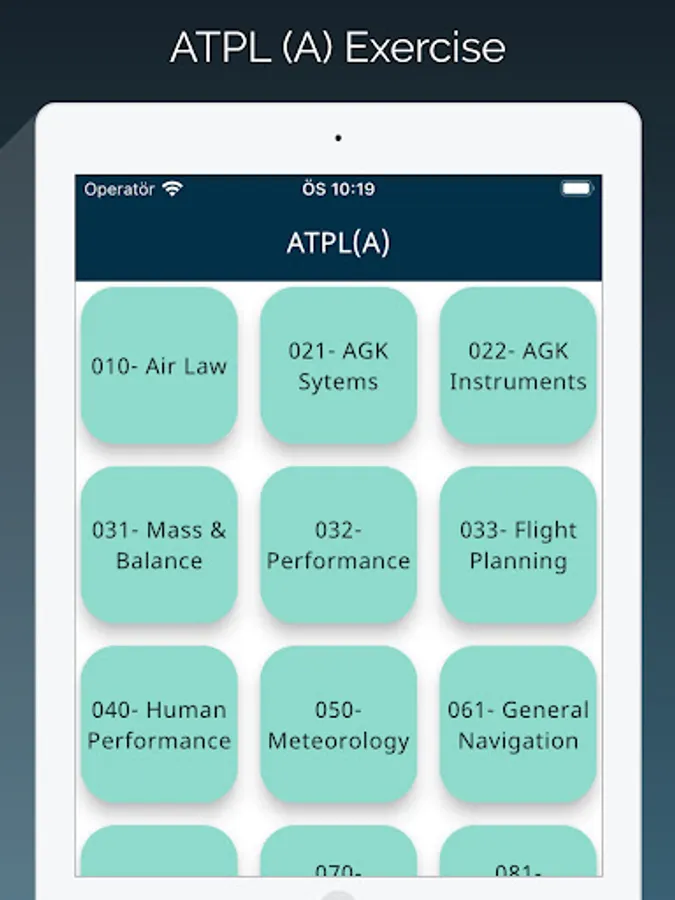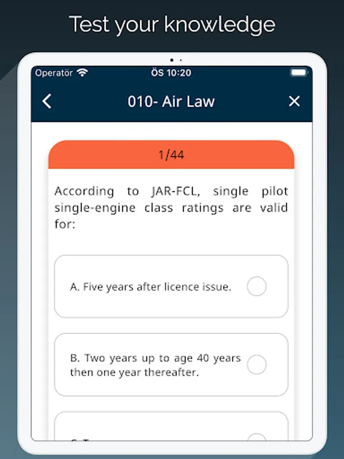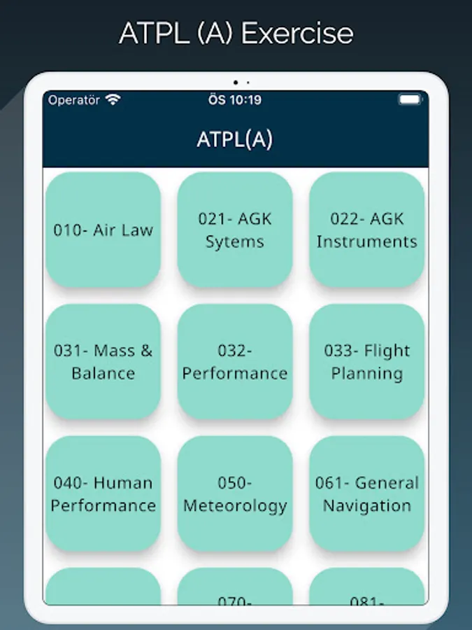 ATPL(A) is designed for practicing aviation exams. It consists two modele which are study and test modules. In exercise user selects desired amount of question and try to solve them with no time limit. In the test module app selects questions for you as a real test and provides a clock for remaining time. Requires no internet connection. Download and use as much as you need. We provide 14 different lesson questions which are required to get an ATPL(A) Licence.
