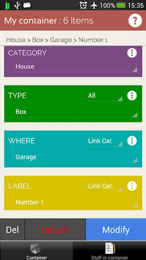It allows you to carry out the inventory of your things by use of 4 different feature to define your container :