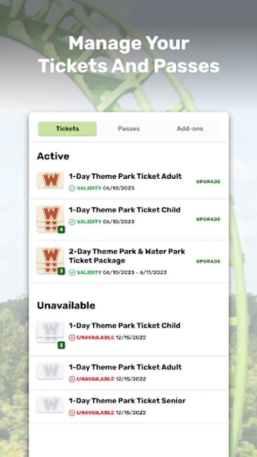 Account Integration - Link your day tickets, Season Passes, Bring-A-Friend tickets, add-ons, and more for quick access. Utilize the app itself or add your tickets and passes to your phone’s digital wallet for easy entry and use at the parks.