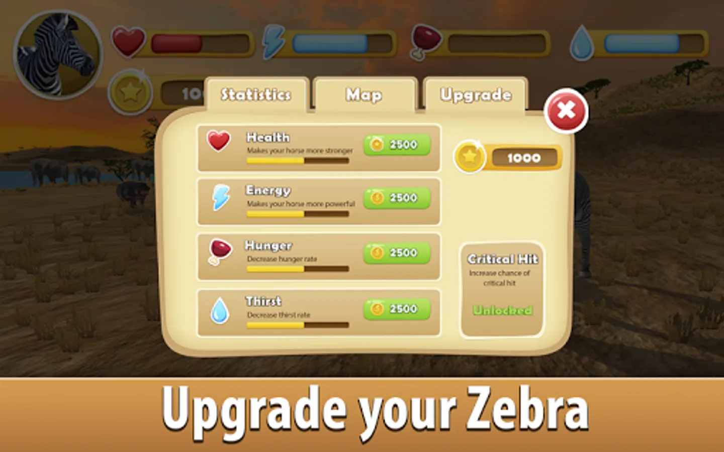 This animal simulator offers you a wildlife survival adventures in savanna. Run your zebra like horse across beautiful wild lands! Maintain zebra's energy, survival in the wild is not easy. Fight with every animal you meet or run at a top speed. Your zebra can even die in the animal survival simulator. But you can travel not alone. Find another zebra and start a horse family. Feel how to be a wild animal. Get next levels to open new survival skills.