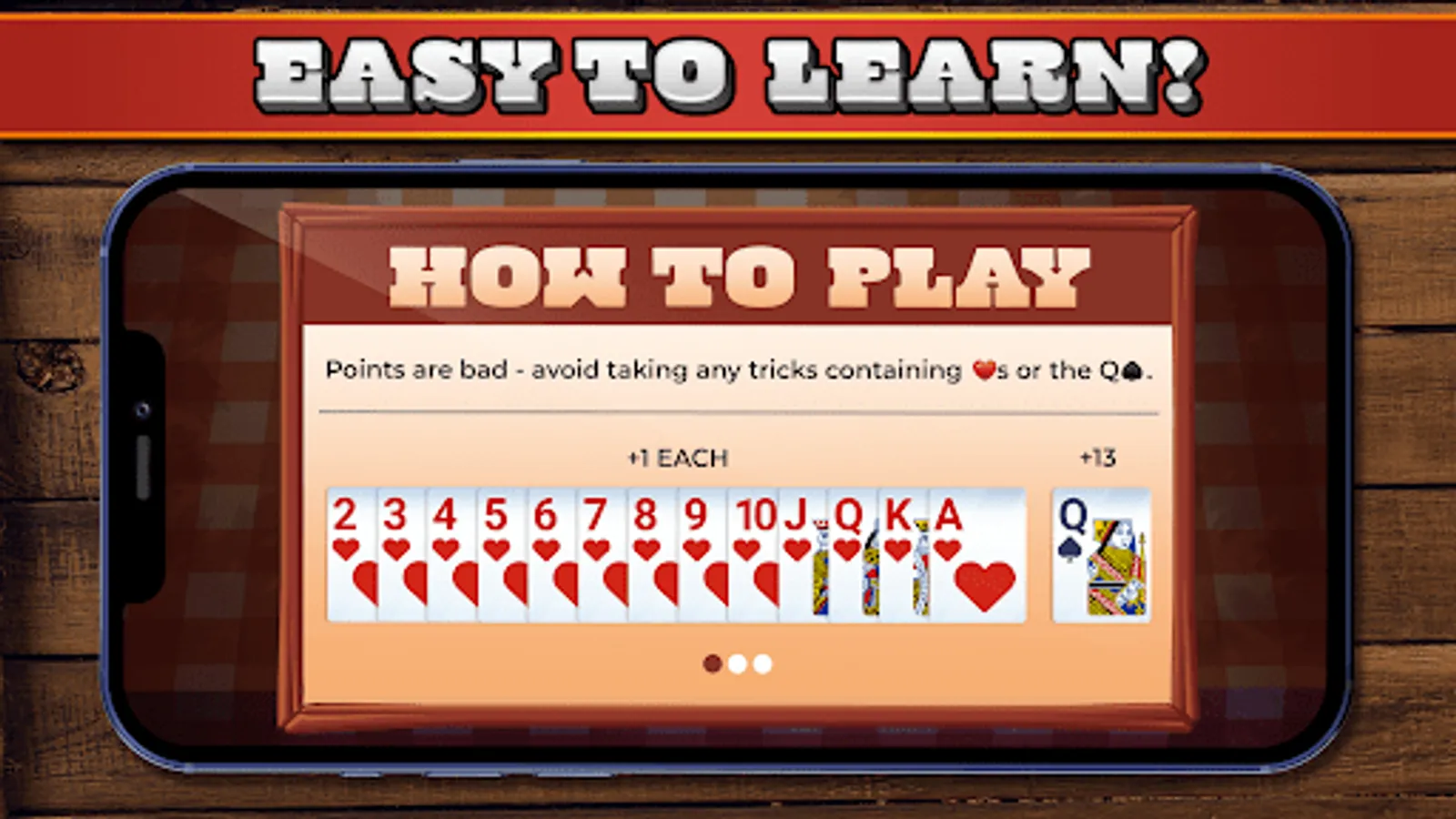 Unlike Spades, the lowest score wins! Avoid collecting Hearts and the dreaded Queen of Spades to beat your computer friends. Think you're ready for a challenge? Take on our premium and deluxe computer opponents.