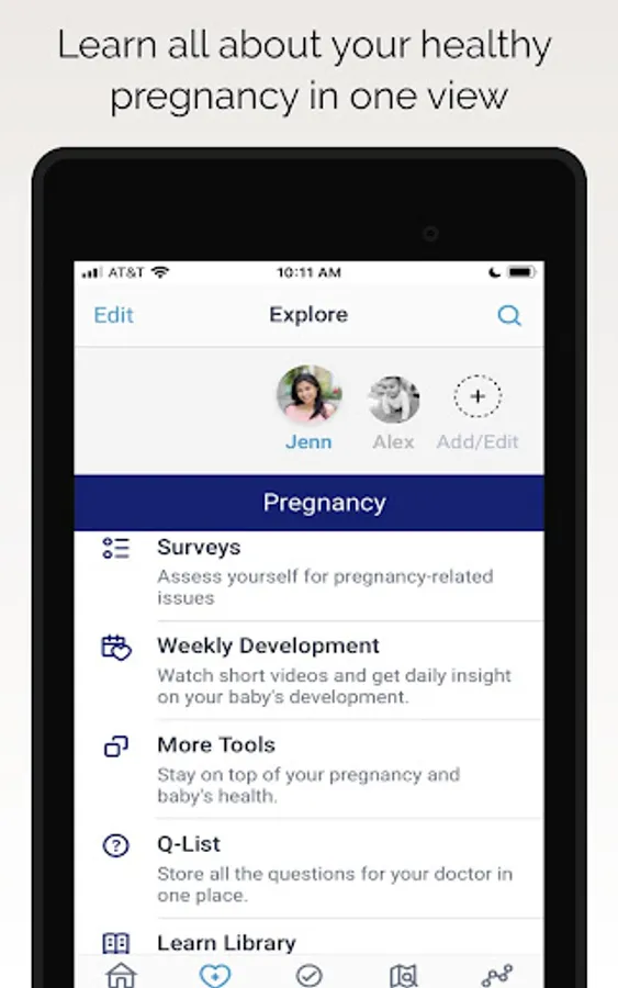 • Pregnancy: Movement tracker to count baby’s kicks, ultrasound videos, weight gain calculator.