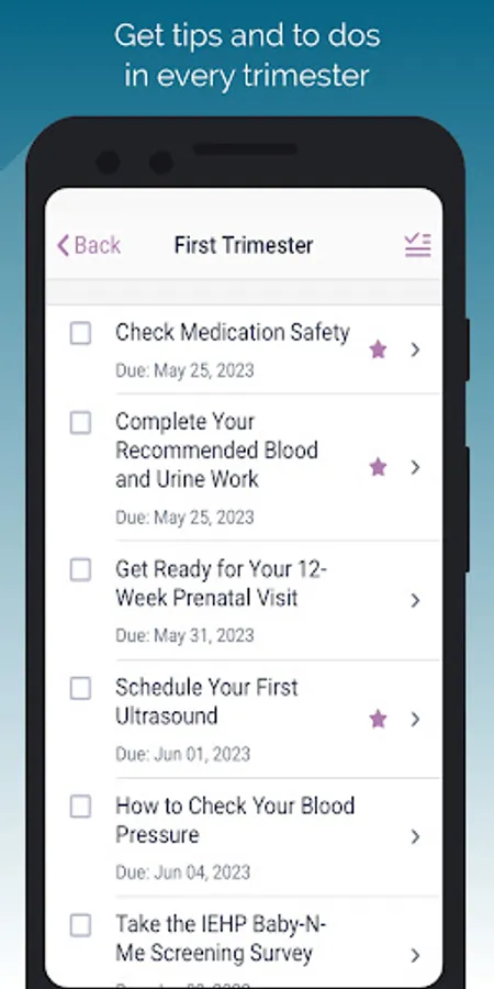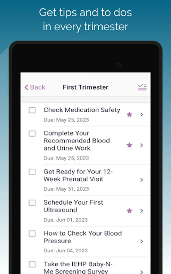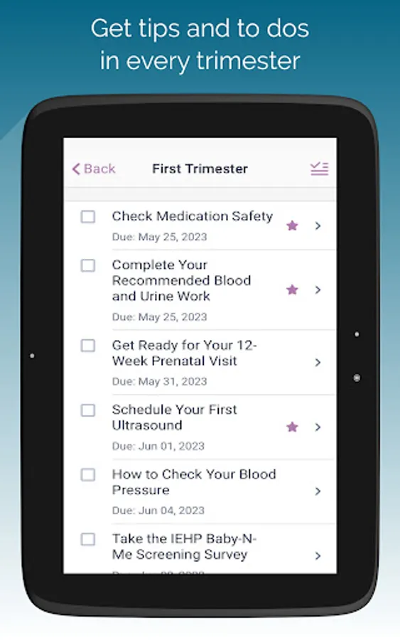 • TO DOS | See To Dos based on your pregnancy weeks. Learn about health benefits to help you stay on track during pregnancy, and after, up to your