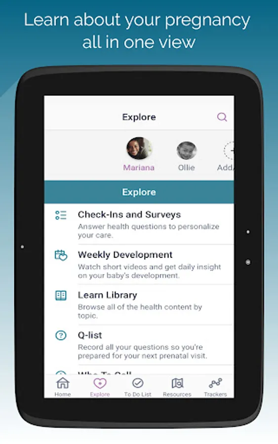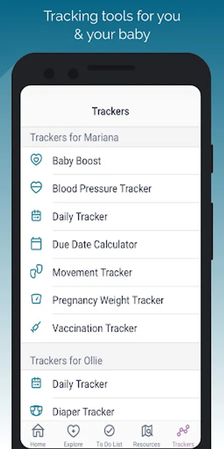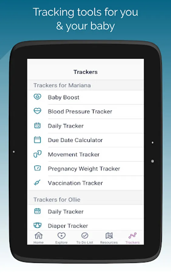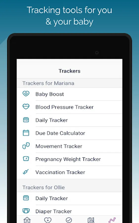 • TRACKERS | Track your baby’s kicks, growth, feeding and diapers.