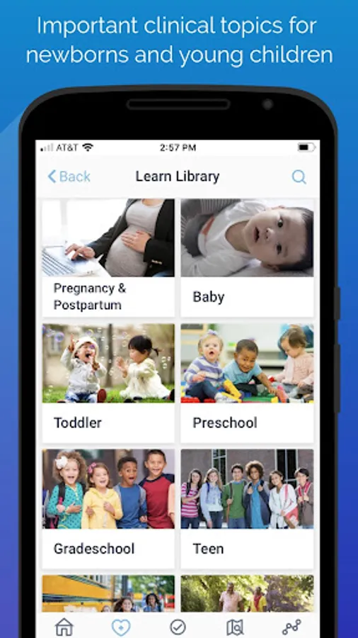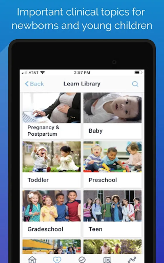 • Important clinical topics for newborns and young children from 0 to 2 years old, like developmental milestones by age, literacy, dental health, and nutrition.