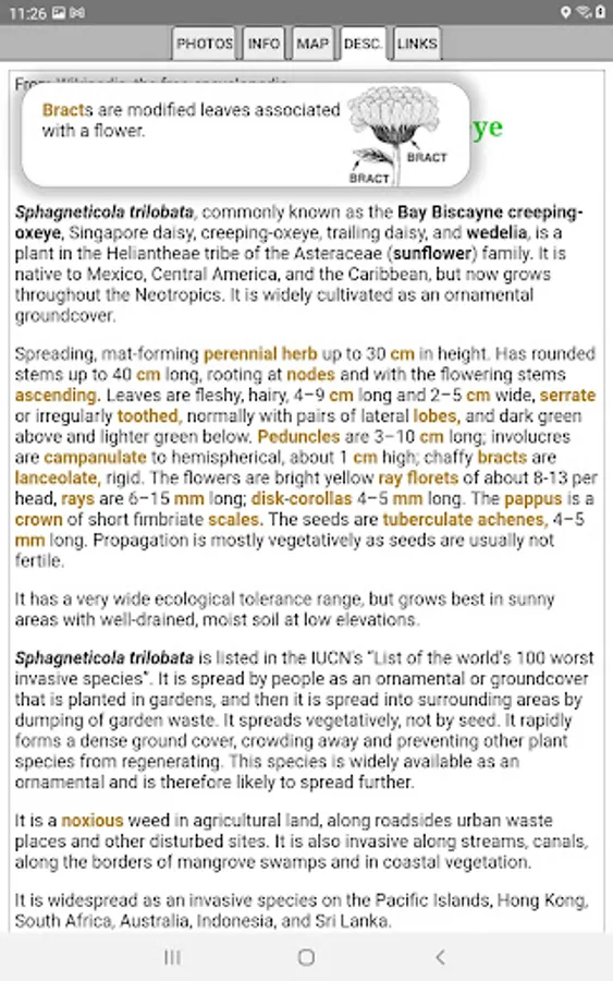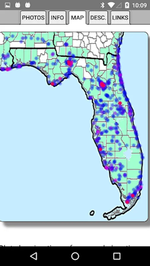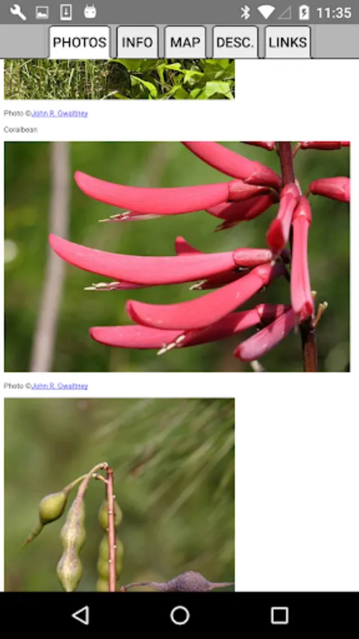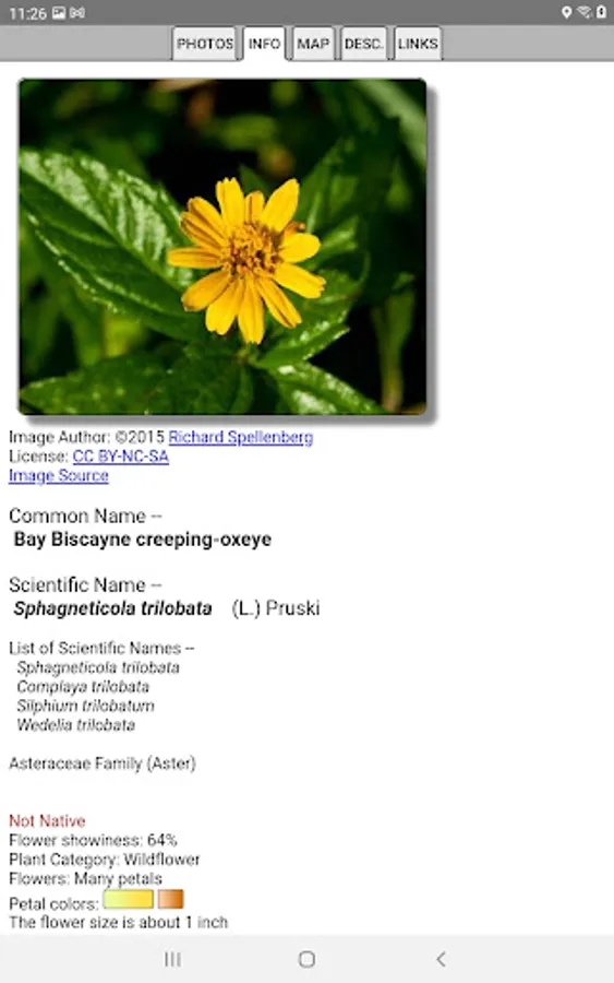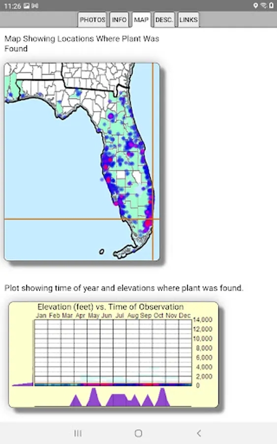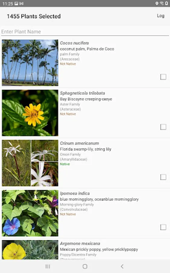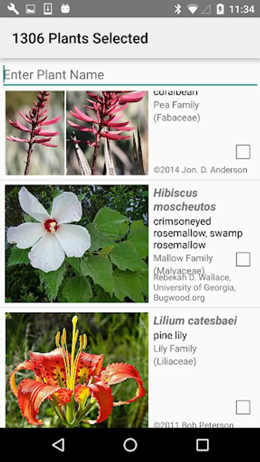 The App includes 3,141 species of plants found in Florida. Overall, 1,624 are "Wildflowers", 341 are shrubs, 298 are broadleaf trees, 26 are conifers, 130 are vines, 6 are cactus, 519 are grass-like, 64 are fern-like, 155 are moss-like, 41 are seaweed and 155 are lichen.