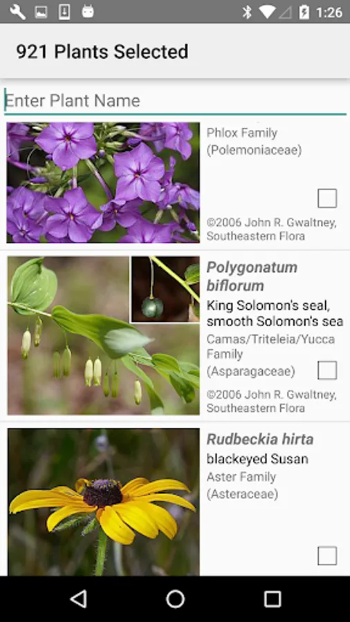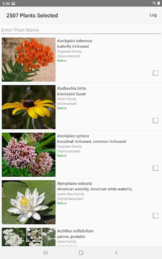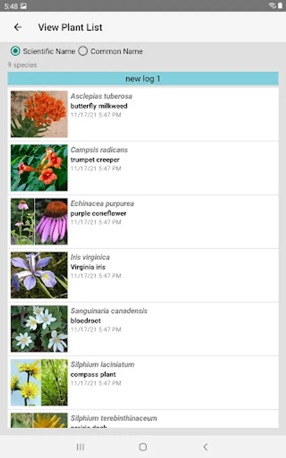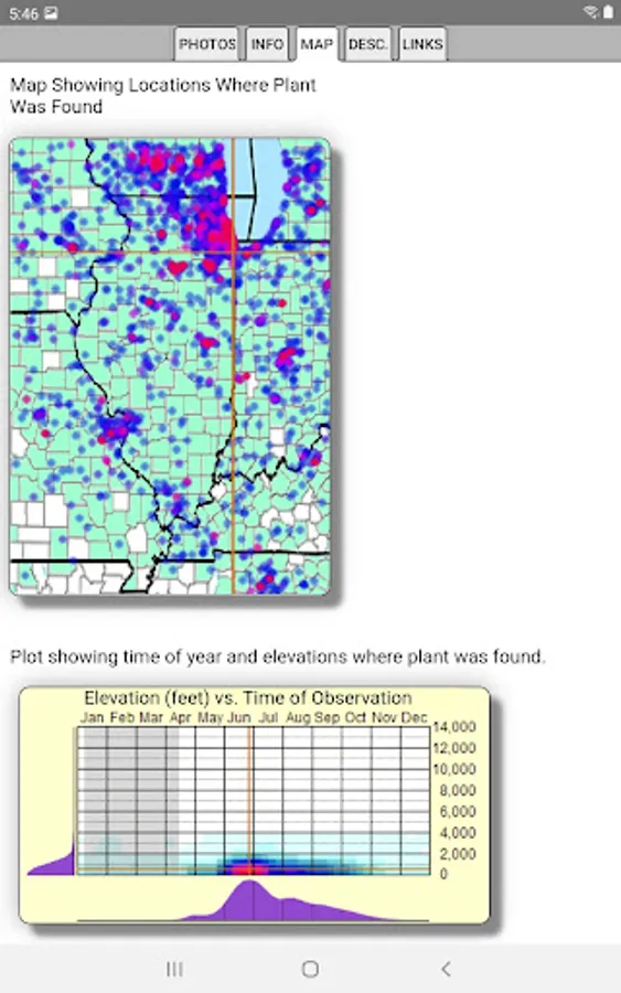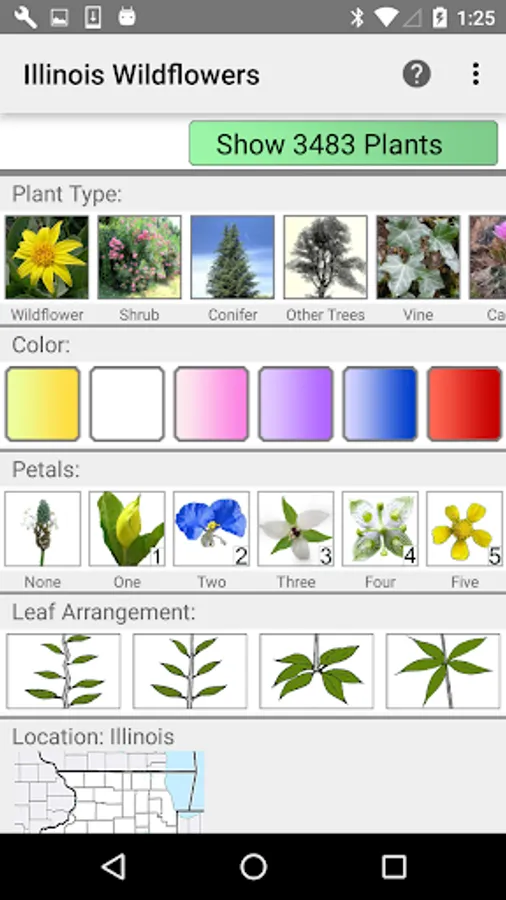 The App includes 3,110 species of plants found in Illinois. Overall, 1,604 are "Wildflowers", 258 are shrubs, 224 are broadleaf trees, 33 are conifers, 78 are vines, 495 are grass-like, 71 are fern-like, 251 are moss-like, and 213 are lichen.