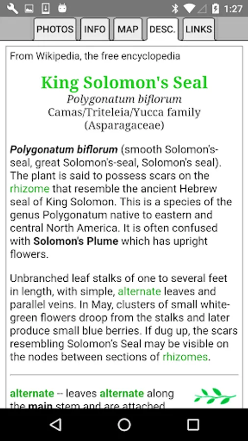 This App helps find and identify plants. When you give the App information about a plant, such as its location, flower color and the time of year, the App will quickly show you which plants match your selections.