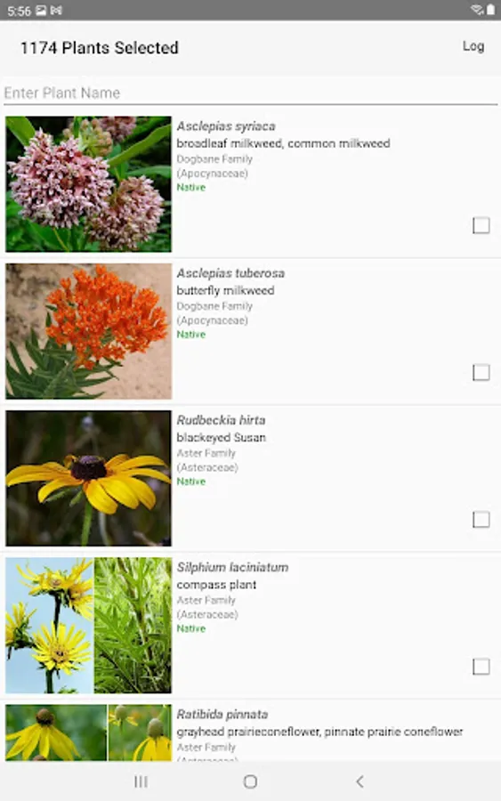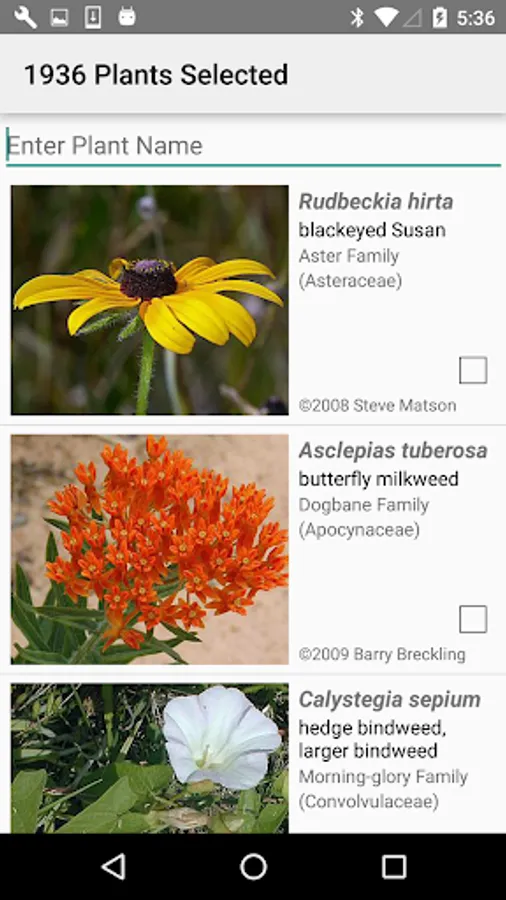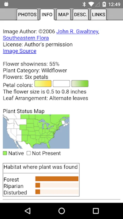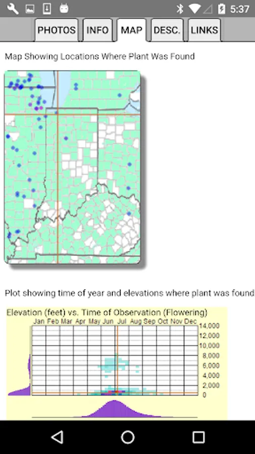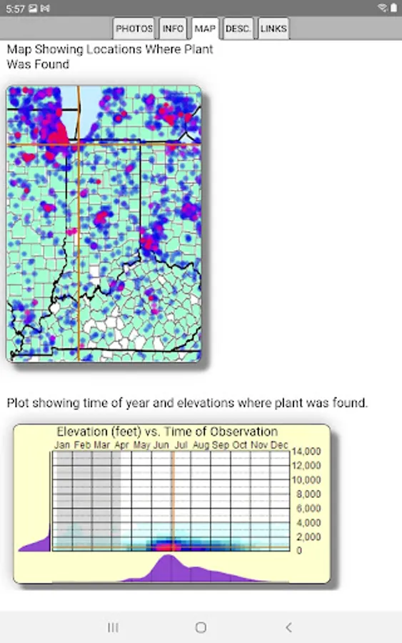 The App includes 2,689 species of plants found in Indiana. Overall, 1,422 are "Wildflowers", 209 are shrubs, 182 are broadleaf trees, 19 are conifers, 71 are vines, 484 are grass-like, 73 are fern-like, 218 are moss-like, and 109 are lichen.