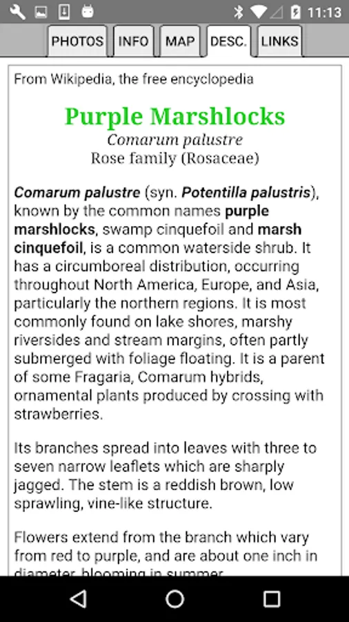 This App helps find and identify plants. When you give the App information about a plant, such as its location, flower color and the time of year, the App will quickly show you which plants match your selections.