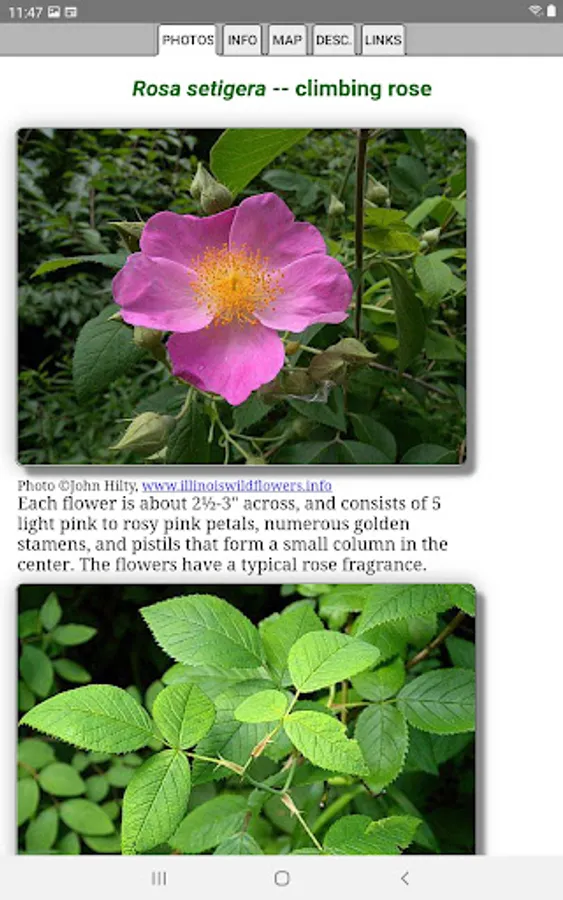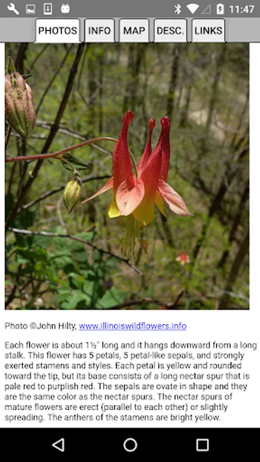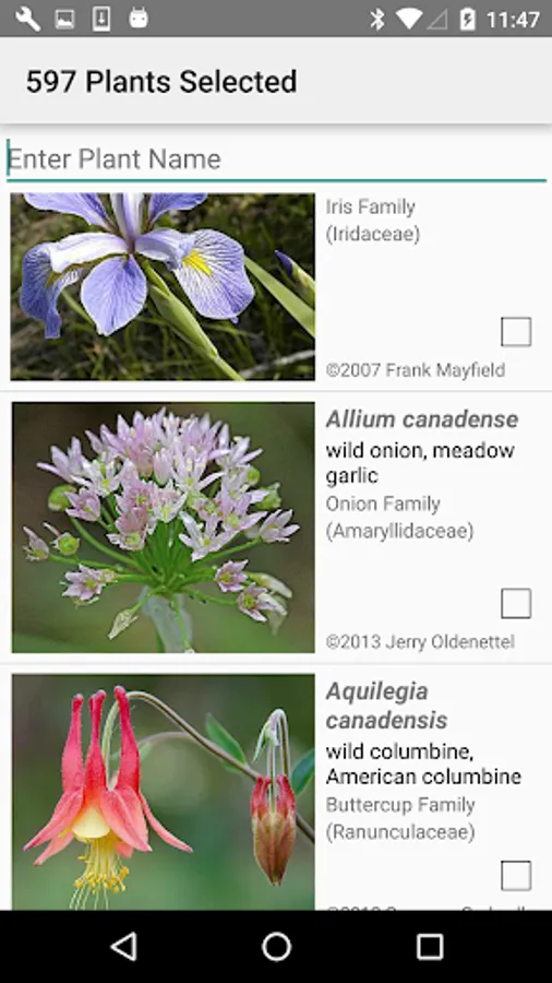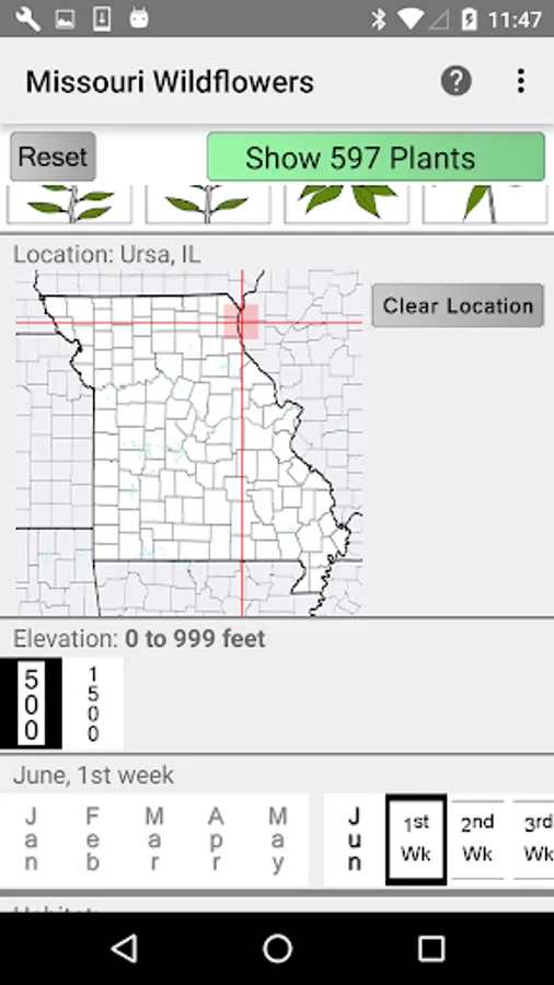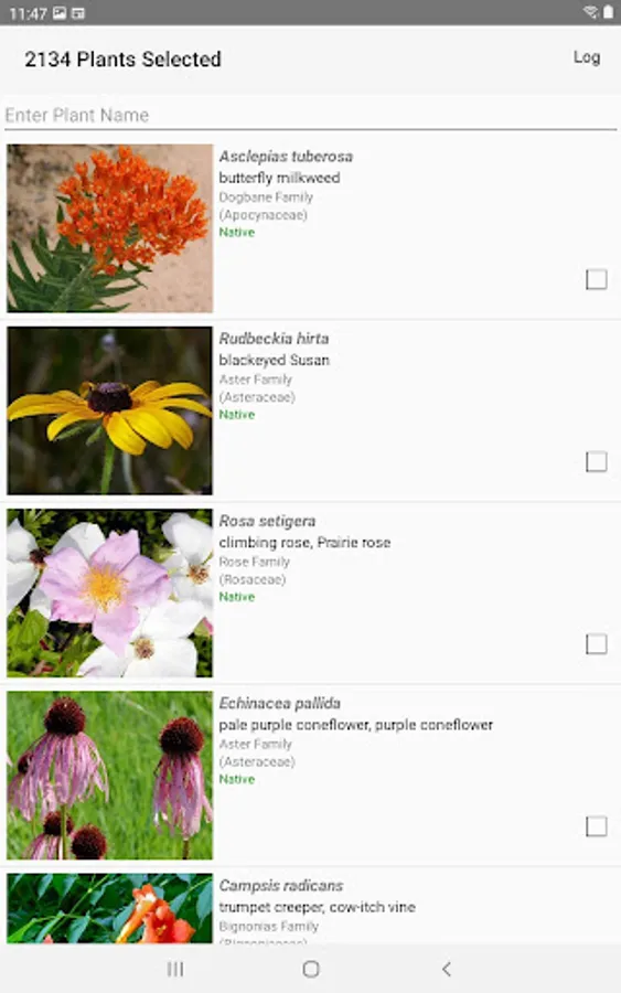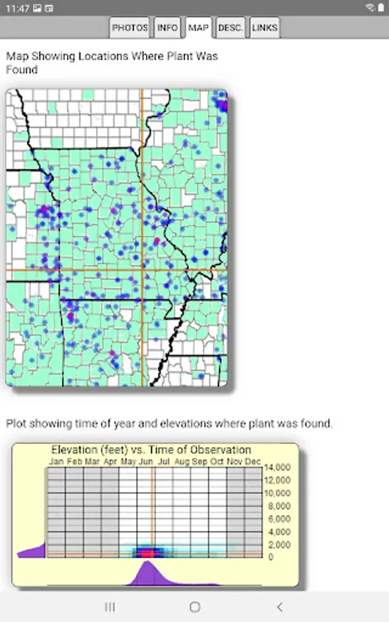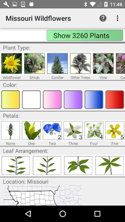 The App includes 3,038 species of plants found in Missouri. Overall, 1,556 are "Wildflowers", 238 are shrubs, 217 are broadleaf trees, 19 are conifers, 93 are vines, 515 are grass-like, 72 are fern-like, 244 are moss-like, and 201 are lichen.