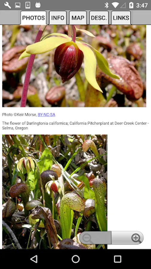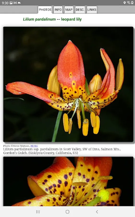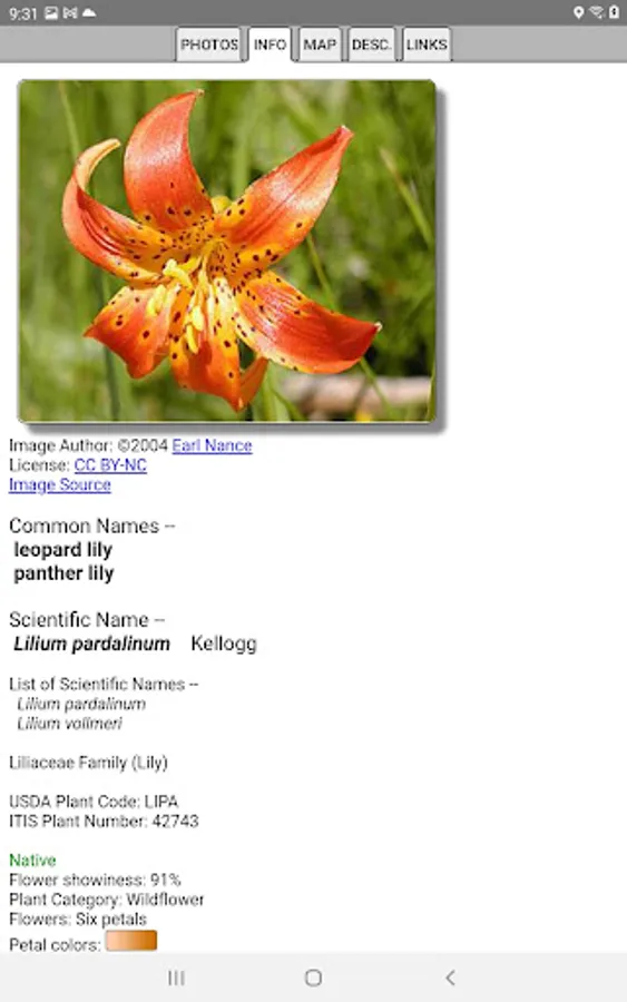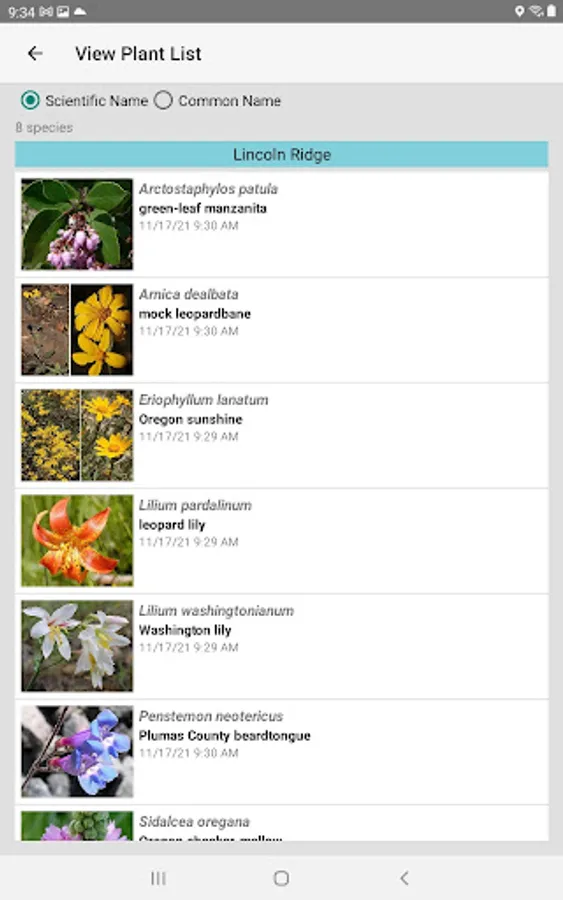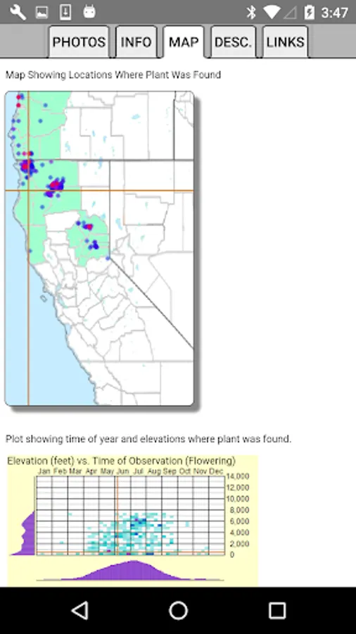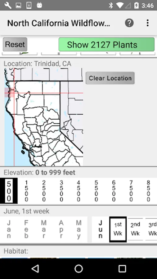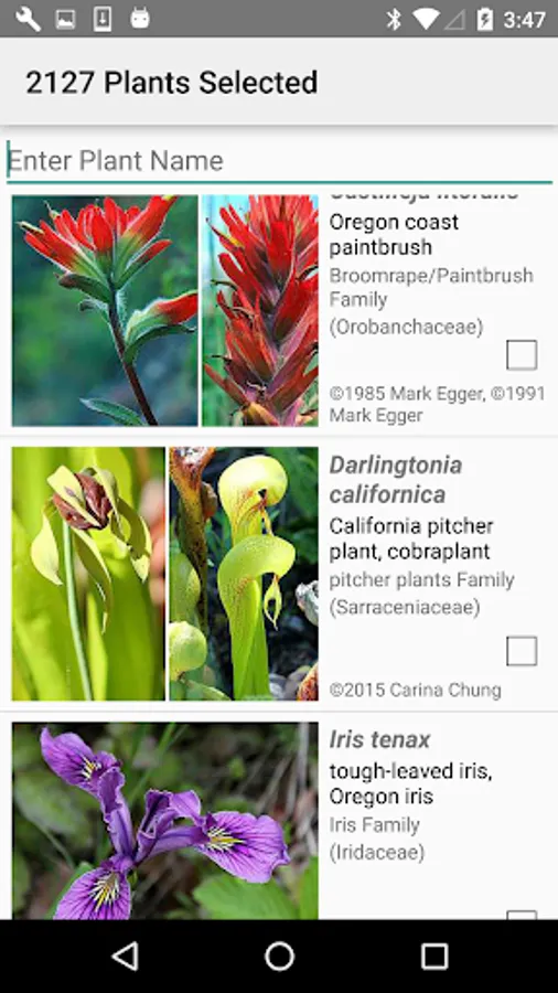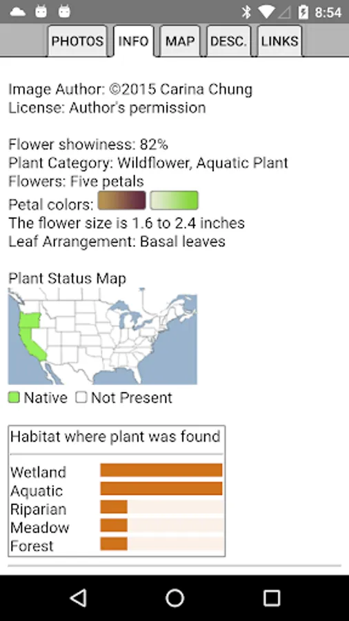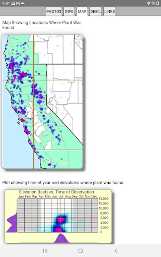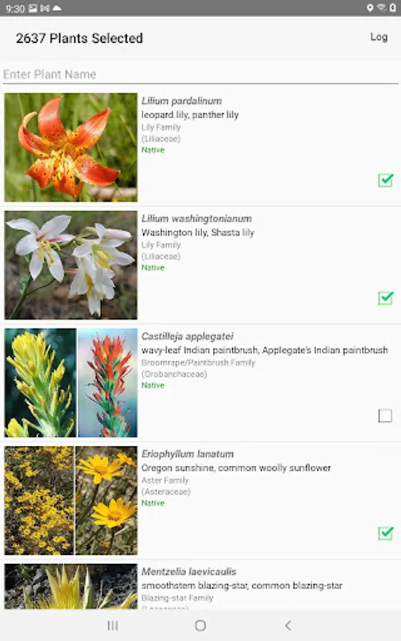 The App includes 3,866 species of plants found in North California. Overall, 2,384 are "Wildflowers", 301 are shrubs, 123 are broadleaf trees, 41 are conifers, 33 are vines, 488 are grass-like, 70 are fern-like, 211 are moss-like, 96 are seaweed and 234 are lichen.