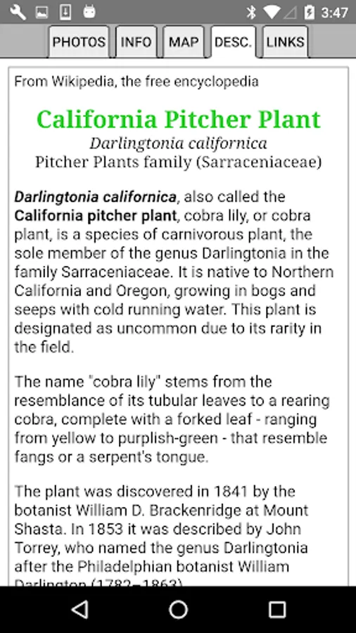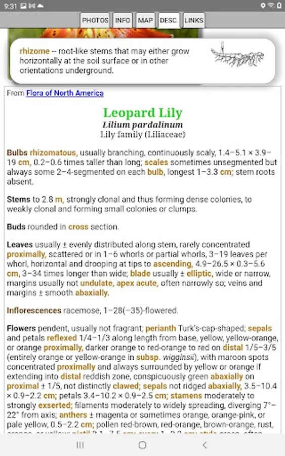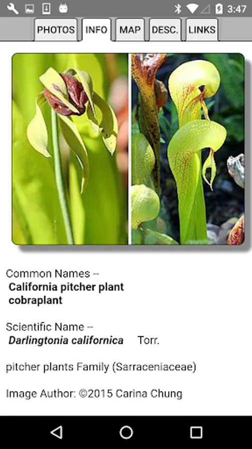 This App helps find and identify plants. When you give the App information about a plant, such as its location, flower color and the time of year, the App will quickly show you which plants match your selections.
