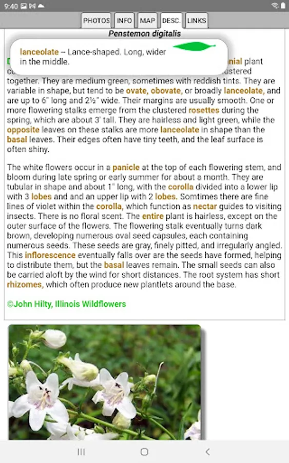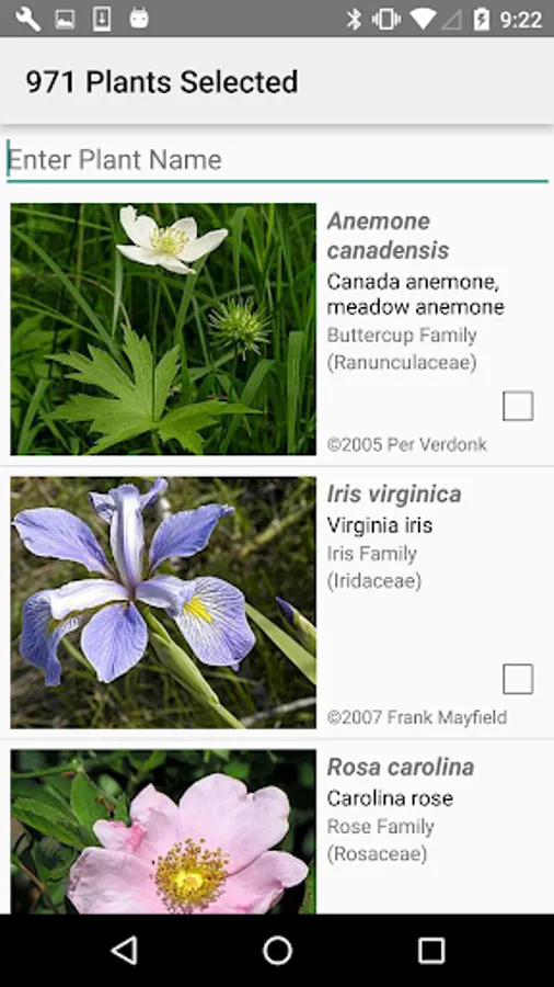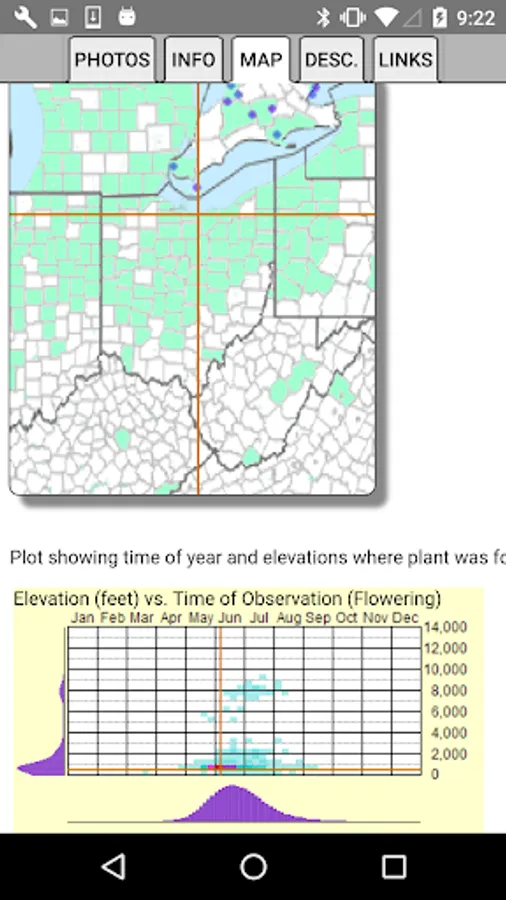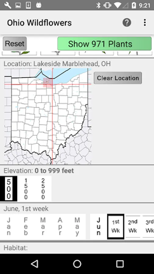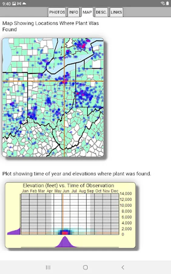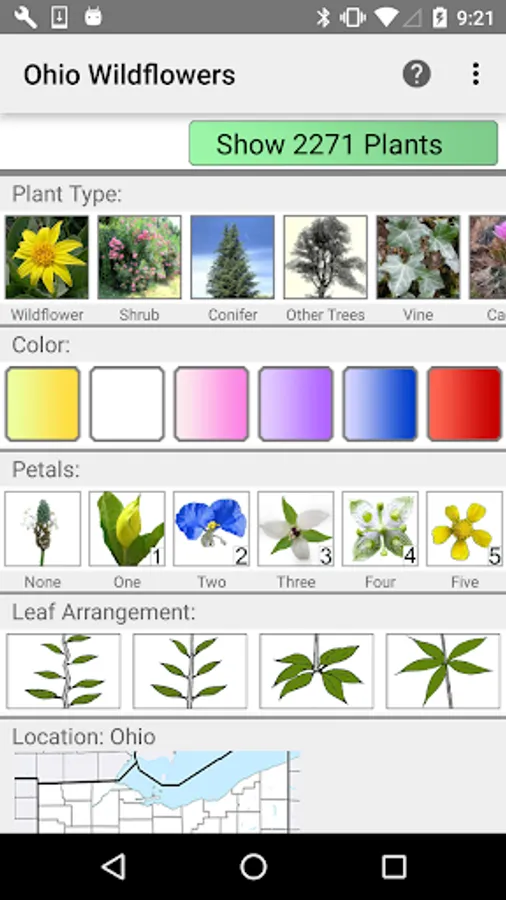 The App includes 2,895 species of plants found in Ohio. Overall, 1,438 are "Wildflowers", 222 are shrubs, 207 are broadleaf trees, 28 are conifers, 62 are vines, 428 are grass-like, 80 are fern-like, 315 are moss-like, and 224 are lichen.