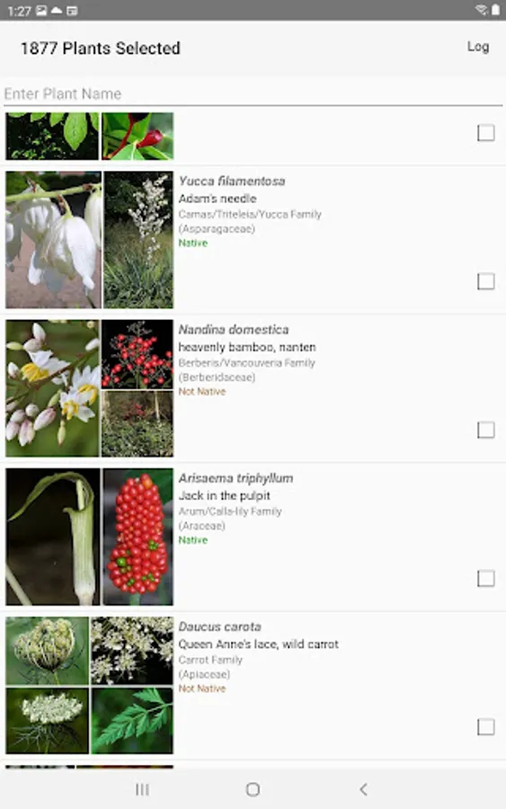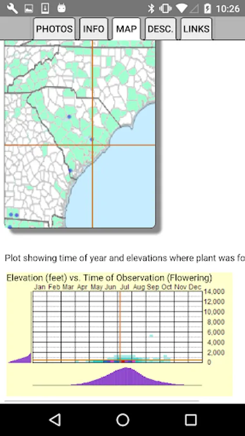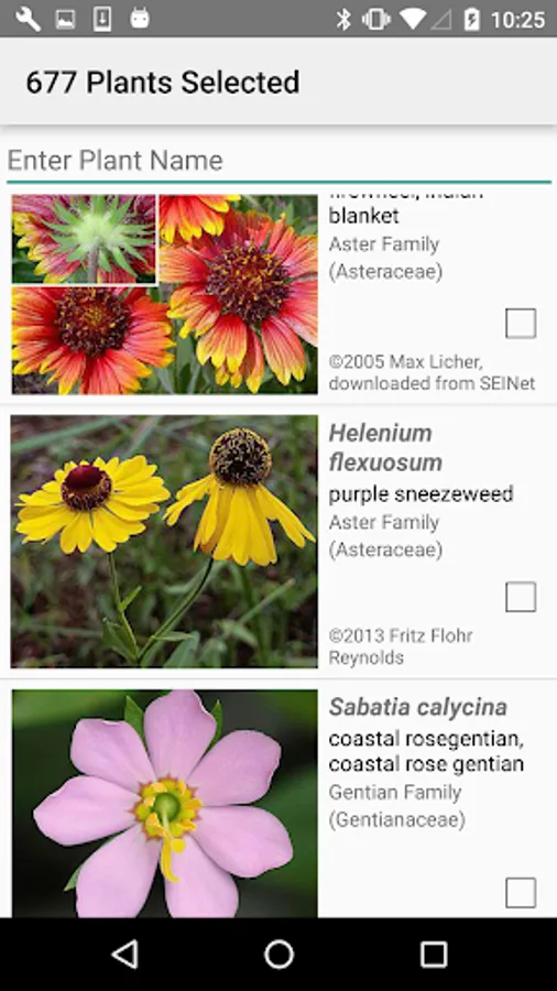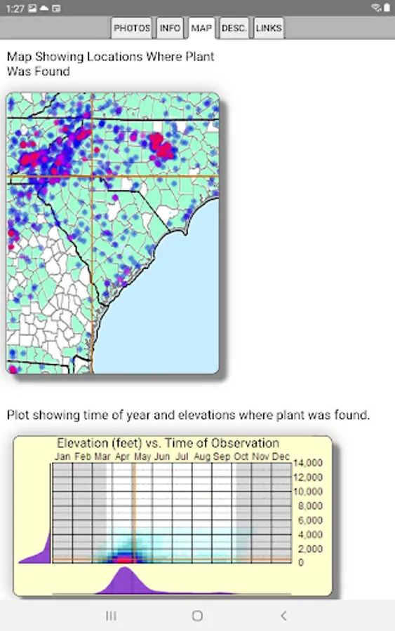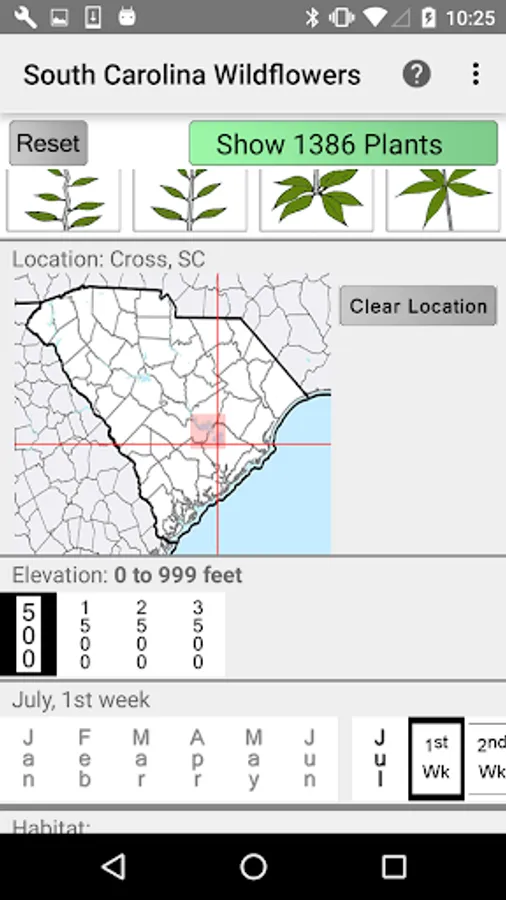 The App includes 3,142 species of plants found in South Carolina. Overall, 1,678 are "Wildflowers", 299 are shrubs, 231 are broadleaf trees, 23 are conifers, 98 are vines, 542 are grass-like, 76 are fern-like, 200 are moss-like, 12 are seaweed and 144 are lichen.