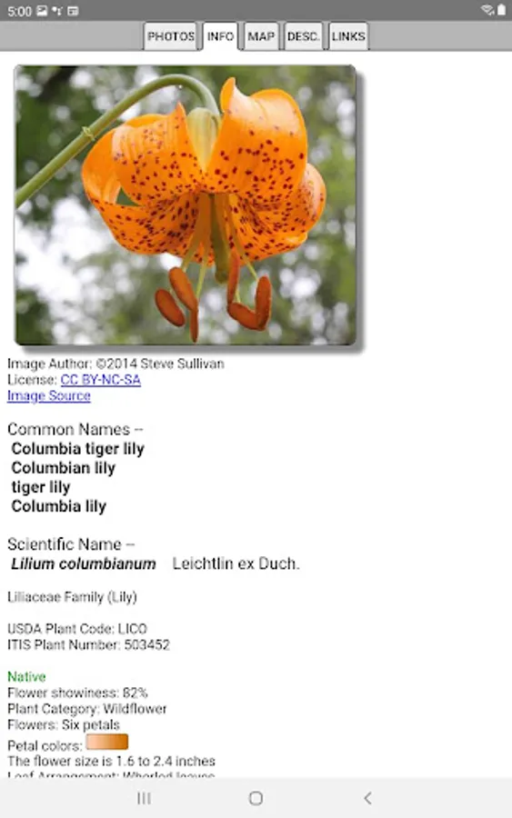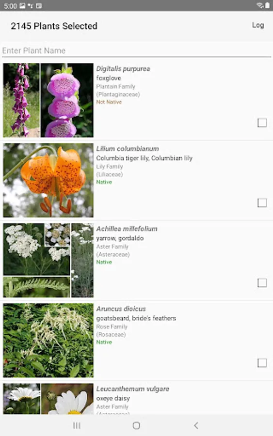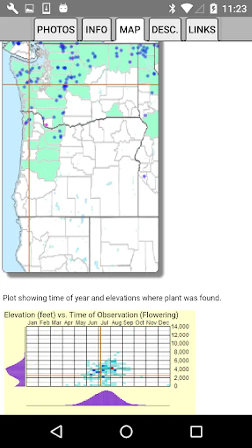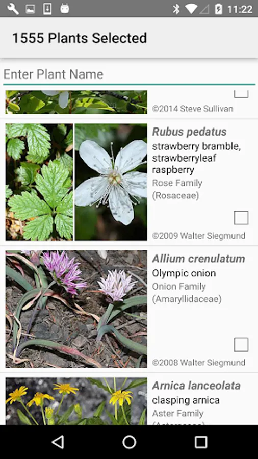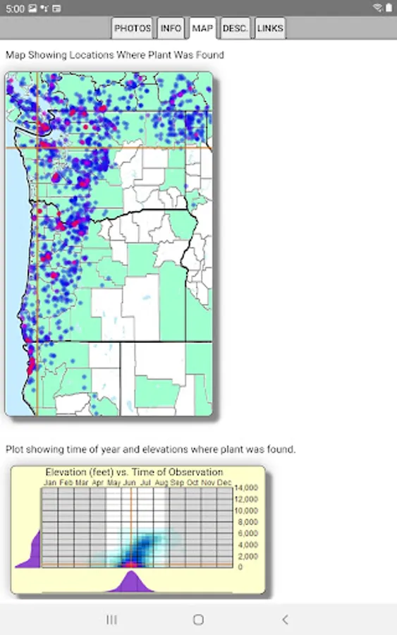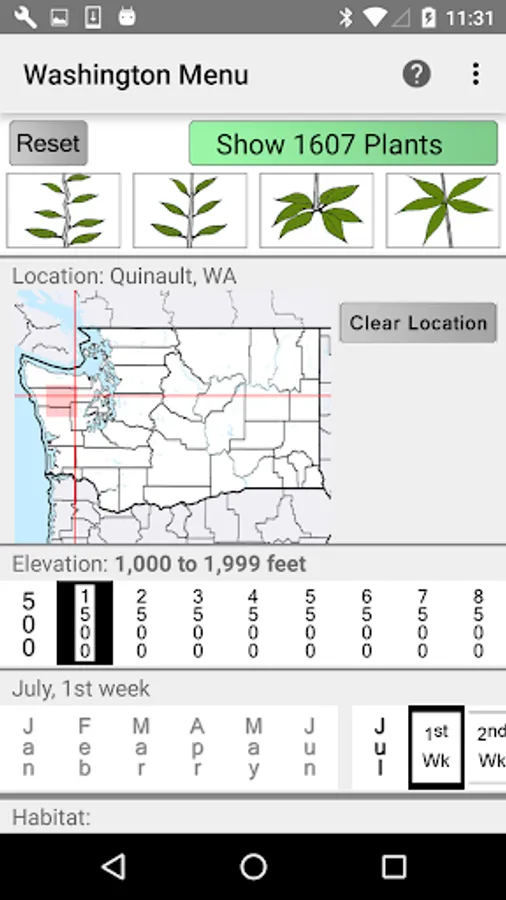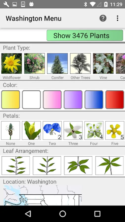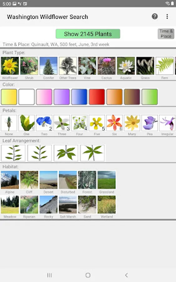 The App includes 3,510 species of plants found in Washington. Overall, 1,899 are "Wildflowers", 258 are shrubs, 114 are broadleaf trees, 31 are conifers, 32 are vines, 453 are grass-like, 94 are fern-like, 298 are moss-like, 113 are seaweed and 318 are lichen.