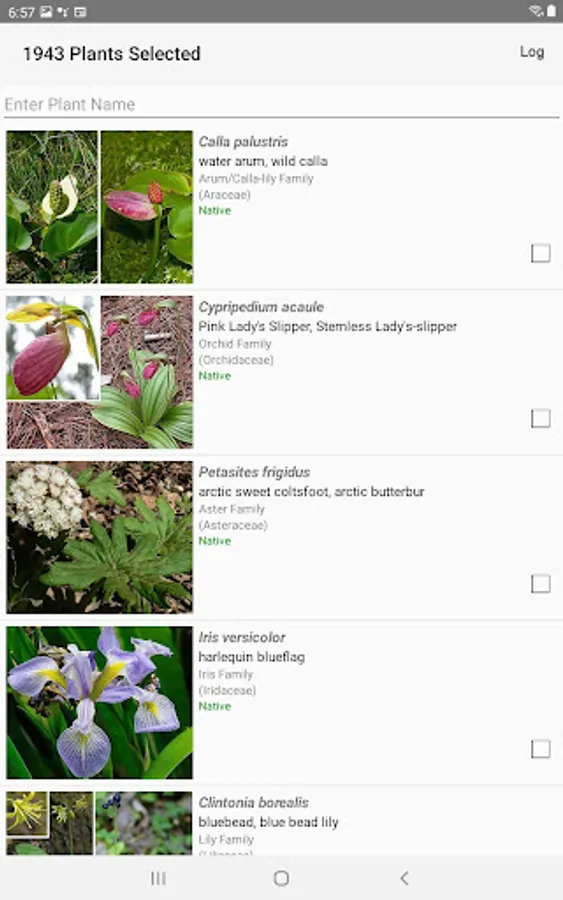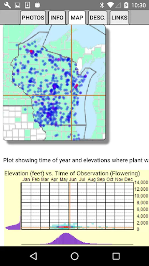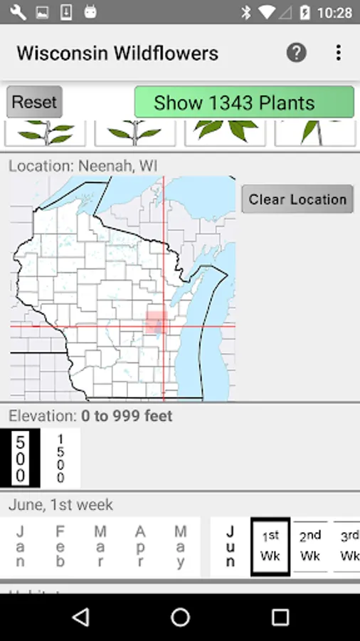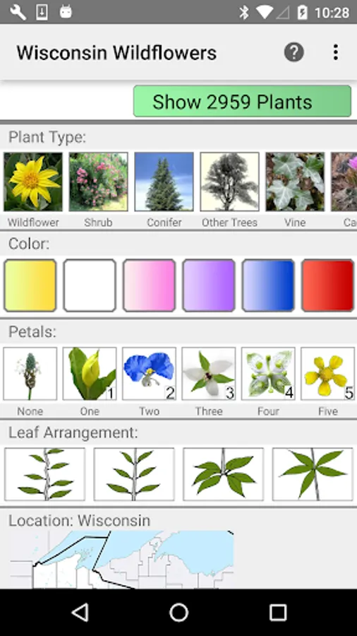 The App includes 2,961 species of plants found in Wisconsin. Overall, 1,418 are "Wildflowers", 213 are shrubs, 148 are broadleaf trees, 21 are conifers, 44 are vines, 486 are grass-like, 92 are fern-like, 299 are moss-like, and 325 are lichen.
