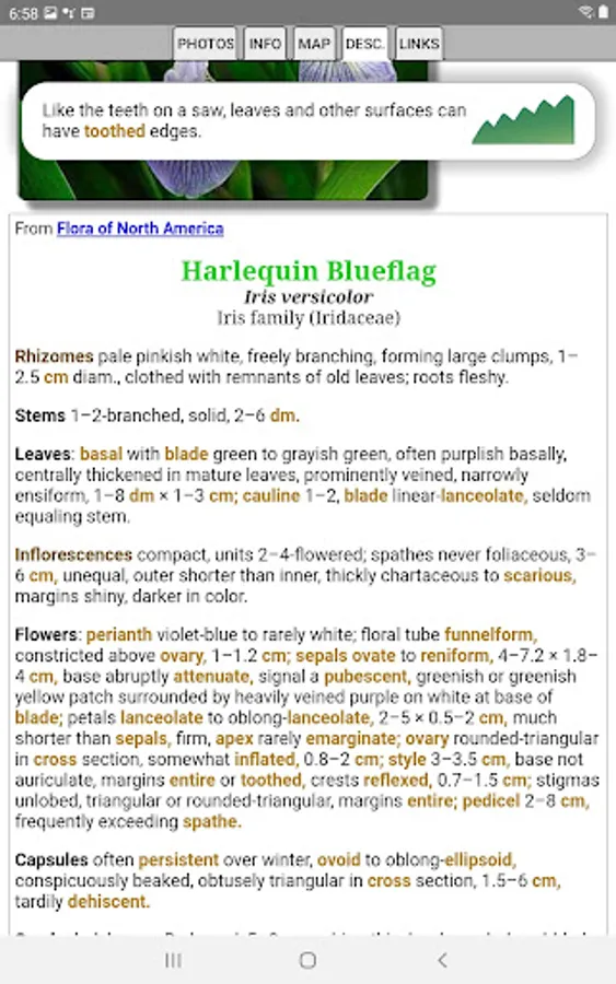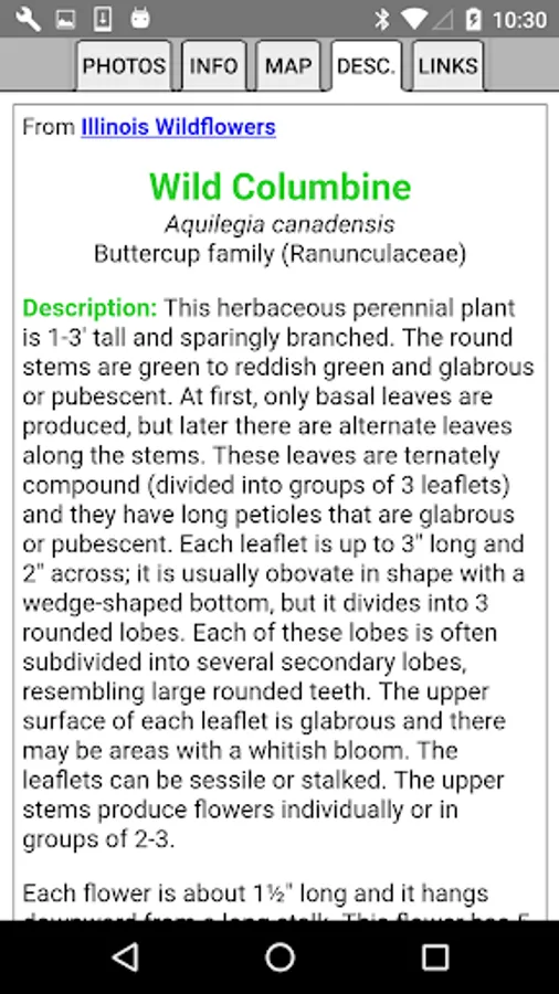 This App helps find and identify plants. When you give the App information about a plant, such as its location, flower color and the time of year, the App will quickly show you which plants match your selections.