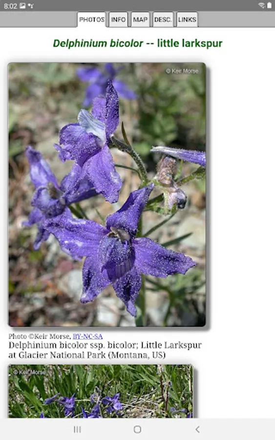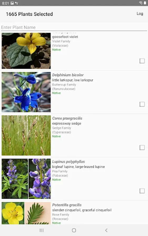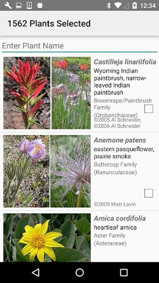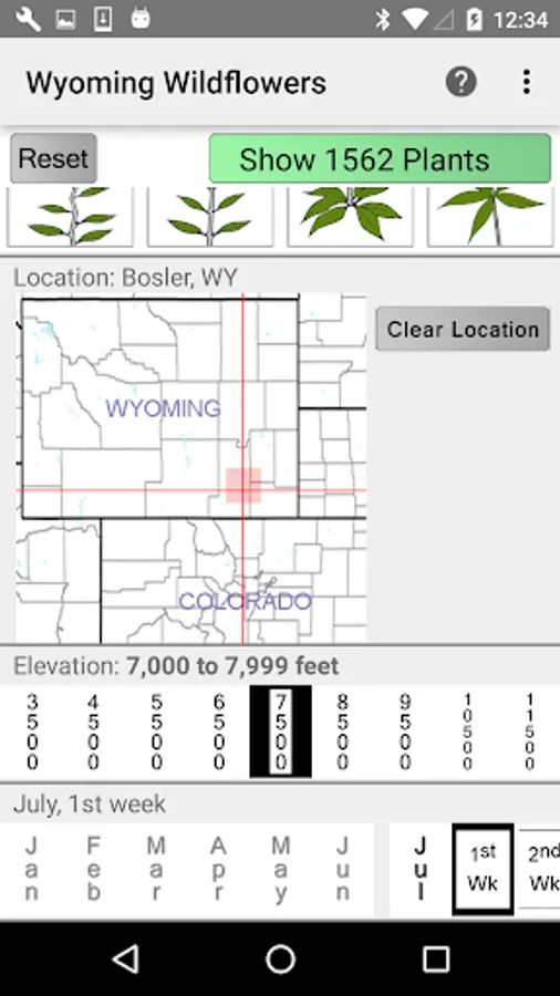 The App includes over 2,691 species of plants found in the Wyoming area. Overall, roughly 1,633 are "Wildflowers", 167 are shrubs, 56 are broadleaf trees, 15 are conifers, 14 are vines, 7 are cactus, 397 are grasses and sedges, 50 are ferns, 224 are lichen and 177 are moss.