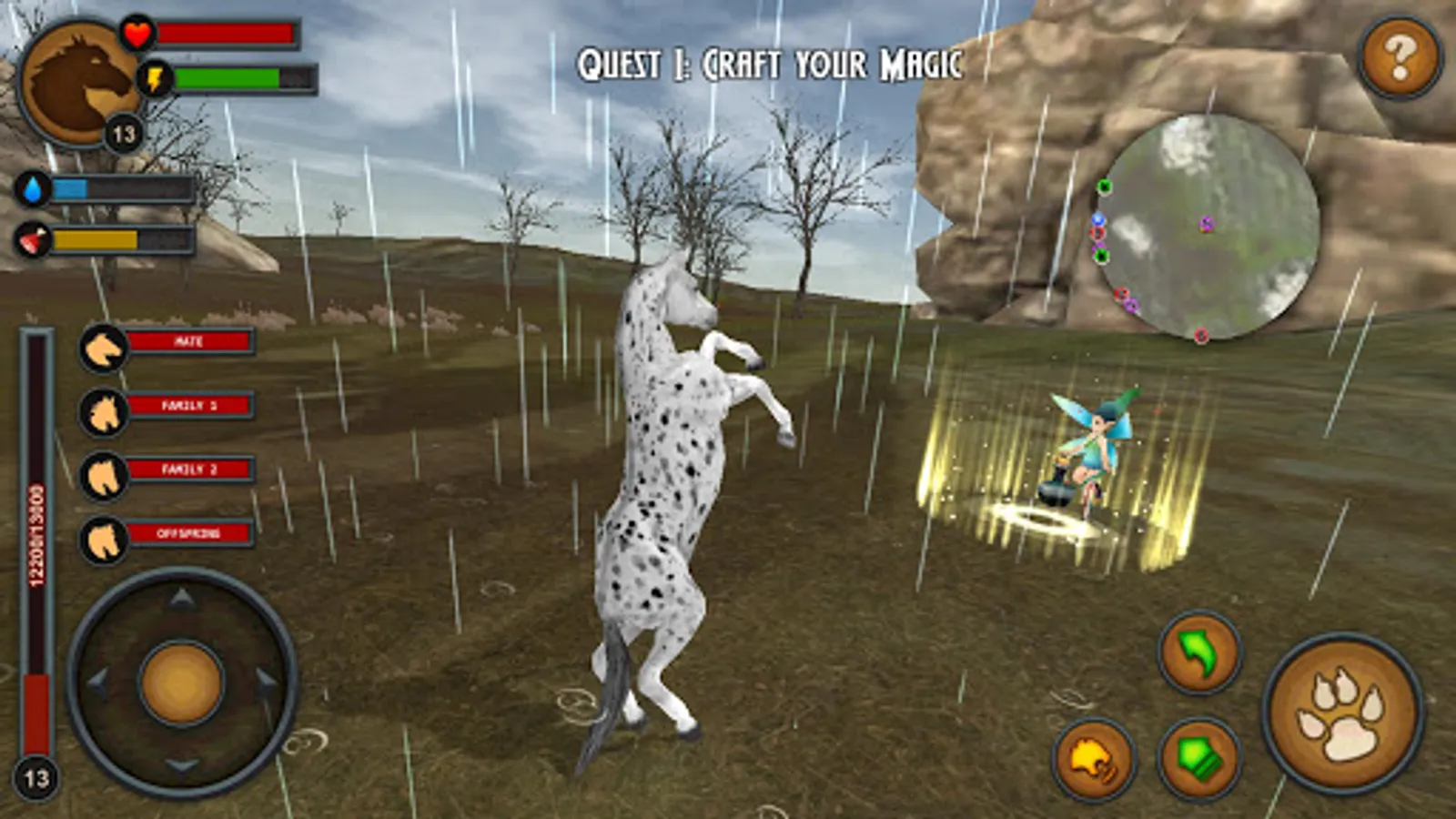 The story begins with your young filly. You must help her find the way in this new world. Locate your family members, mark your territory, and avoid the wild animal enemies. This is the land of wizards, magic and adventure. Your horse will build her skill by successfully completing quests. Along the way, you will develop your hunting skills. You will need to drink water and stay hydrated. Be sure to hunt and eat when your hunger level gets low.