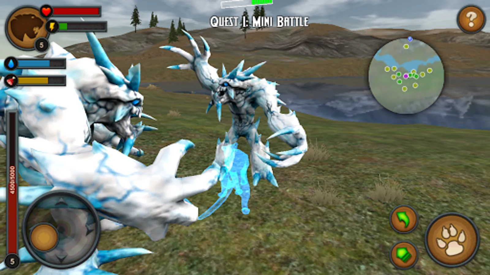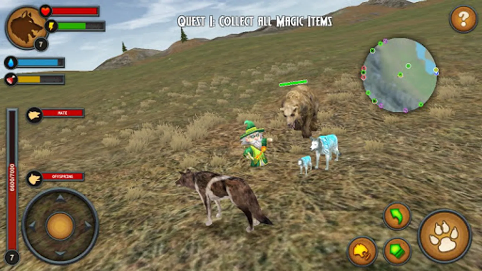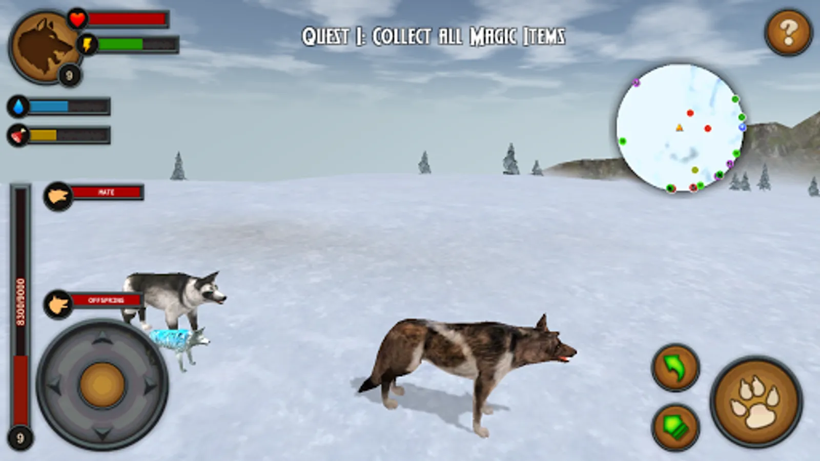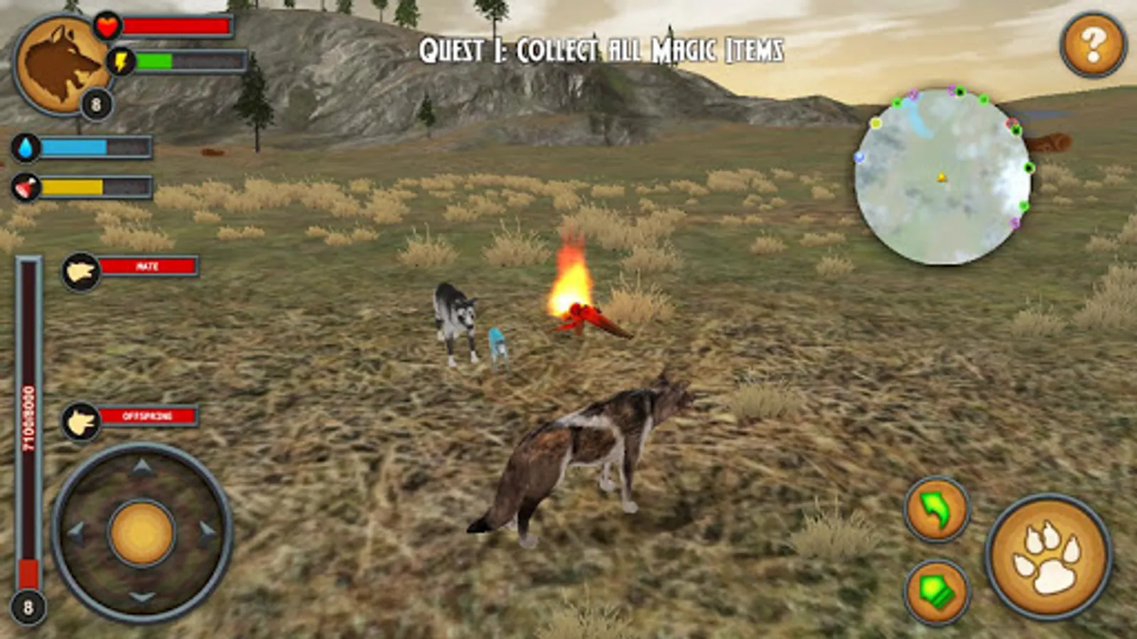 The story begins with a young wolf. Play with some family members, find some food, drink some water, mark some territory, and avoid the enemies. This is the wild land of magic and adventure. Your Wolf will build her skill by completing various quests. Along the way, you will develop your hunting skills. You will need to drink water and stay hydrated. Be sure to hunt and eat when your hunger level gets low.
