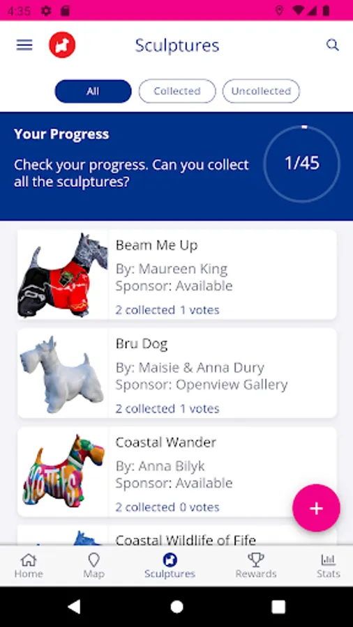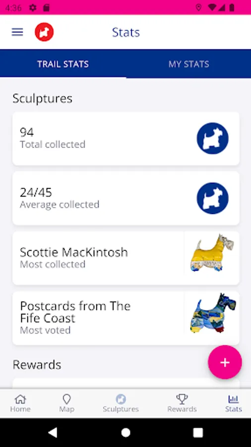 Art trail app includes: map, sculpture listings, design inspiration, sculpture and milestone rewards, sculpture galleries, voting, trail stats, social sharing and event listings.