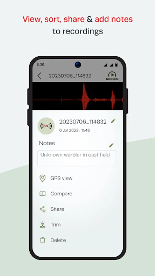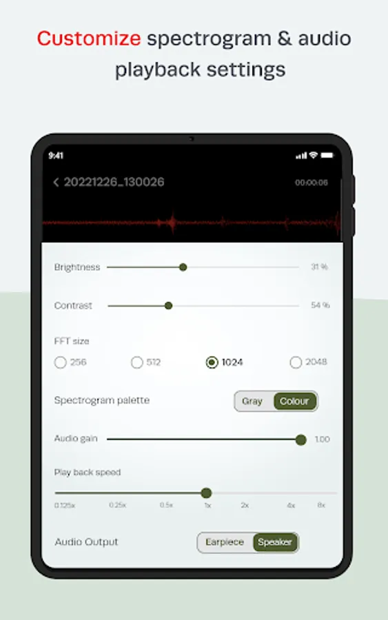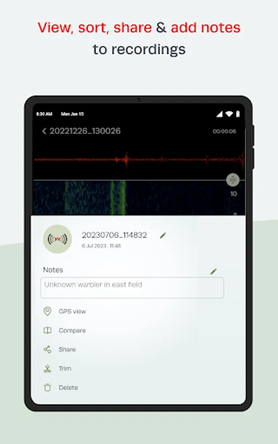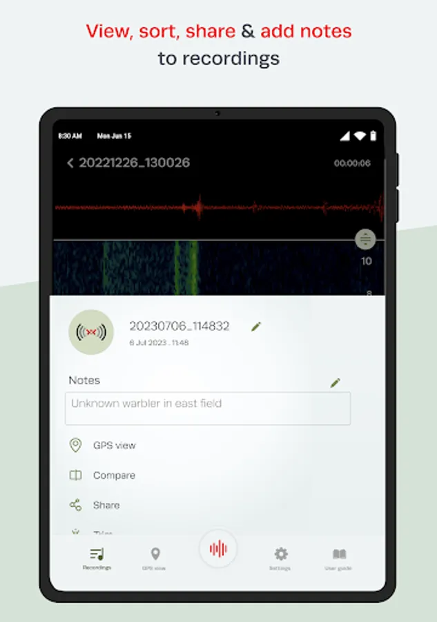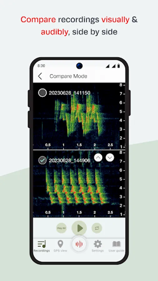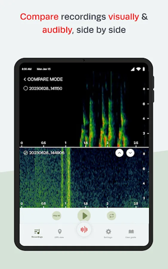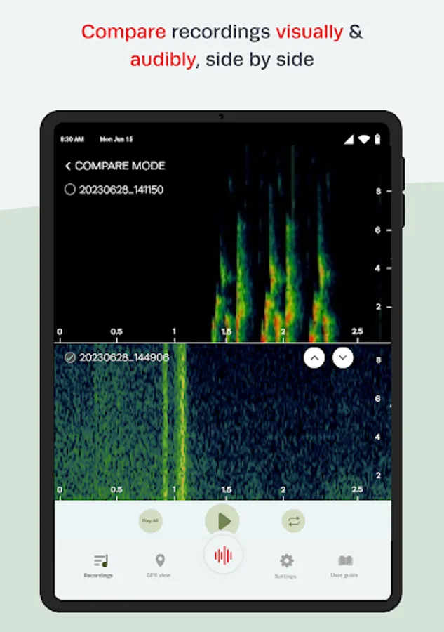 View waveforms or spectrograms and listen to your recordings at your convenience. Use Compare Mode to juxtapose two recordings for detailed analysis.