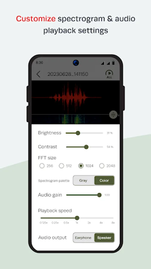 Adjust brightness, contrast, and FFT size settings to fine-tune your viewing experience. Whether you prefer a gray or color palette, our spectrogram offers superior detail to help you distinguish unique wildlife sounds.