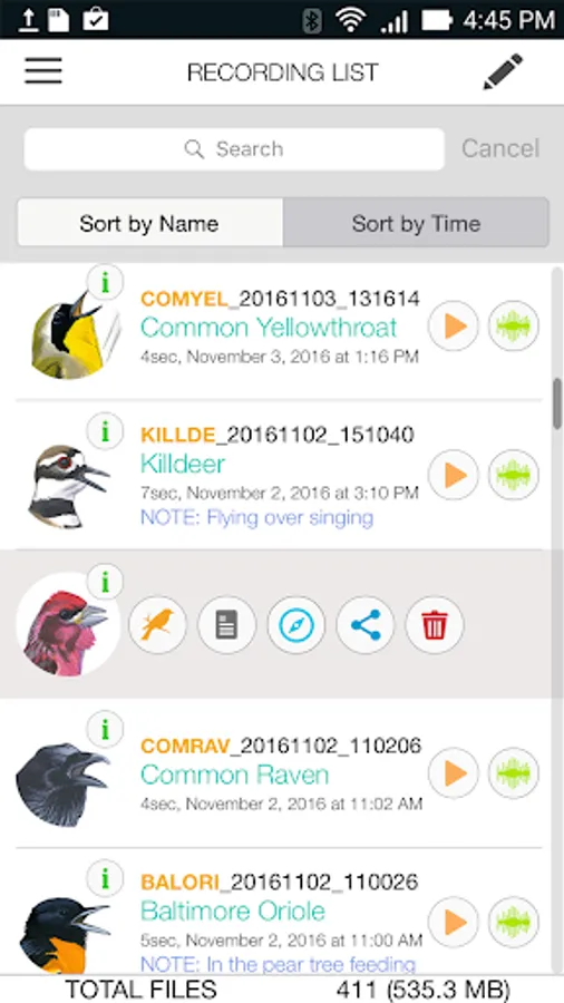 Recordings are saved in the RECORDING LIST where you can view the recording’s spectrogram, listen to the recording (and speed it up or slow down), add a text note, or view the GPS location. You can also trim the recording or filter the frequency range to remove extraneous sounds. Recordings can be shared with other Song Sleuth users via text messaging or email.