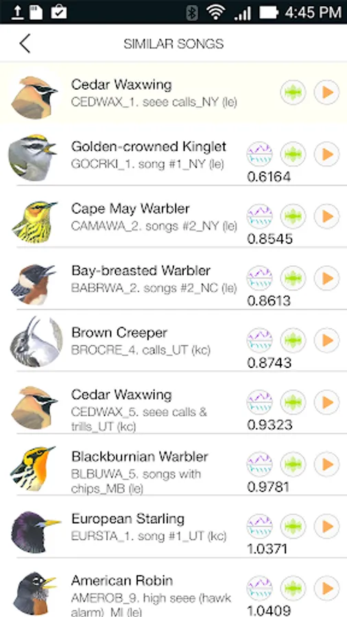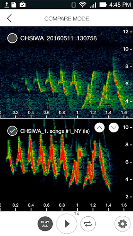 Simply press the record button when you hear a bird singing and the app begins recording a few seconds back in time using the built-in microphone. Tap the record button again when the song is complete and Song Sleuth immediately shows you three most likely species. To assist you in determining the correct bird, you can listen to your recording and the example recordings of the likely matches as well as compare their spectrograms side-by-side.