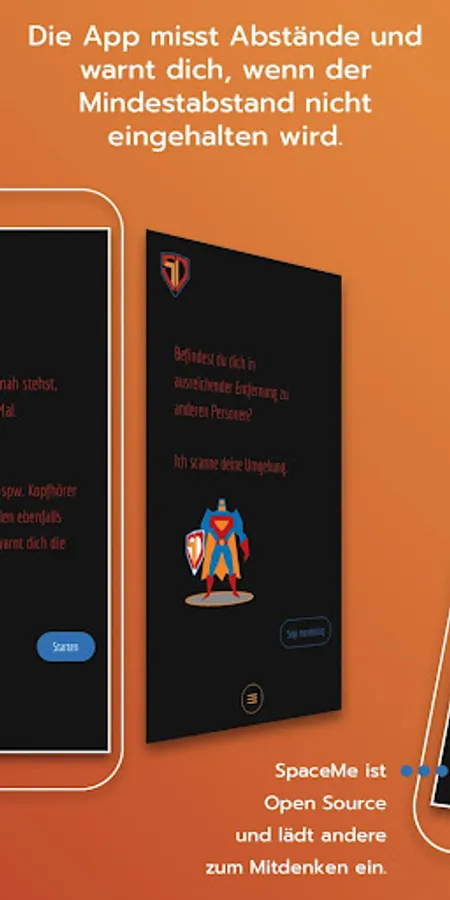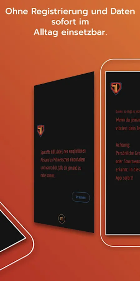 1. KEEP DISTANCE: The app helps you to keep your distance from other people. As soon as the distance is less than 2m, you will be warned by a vibration.