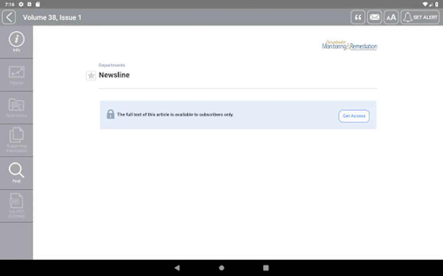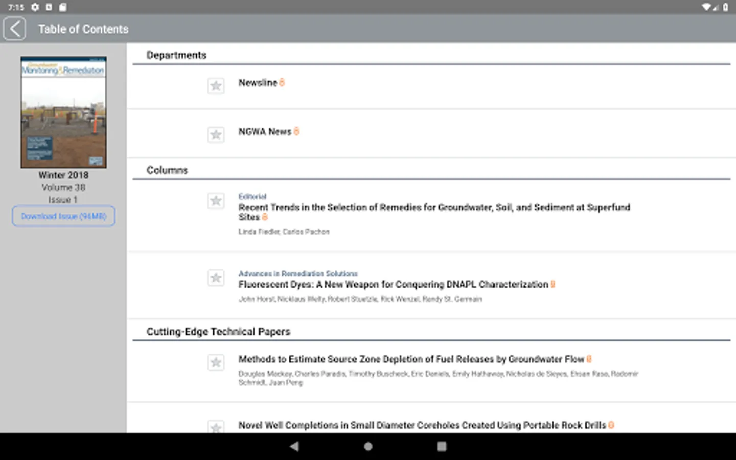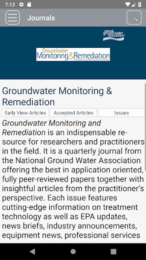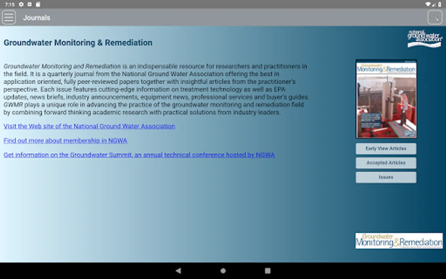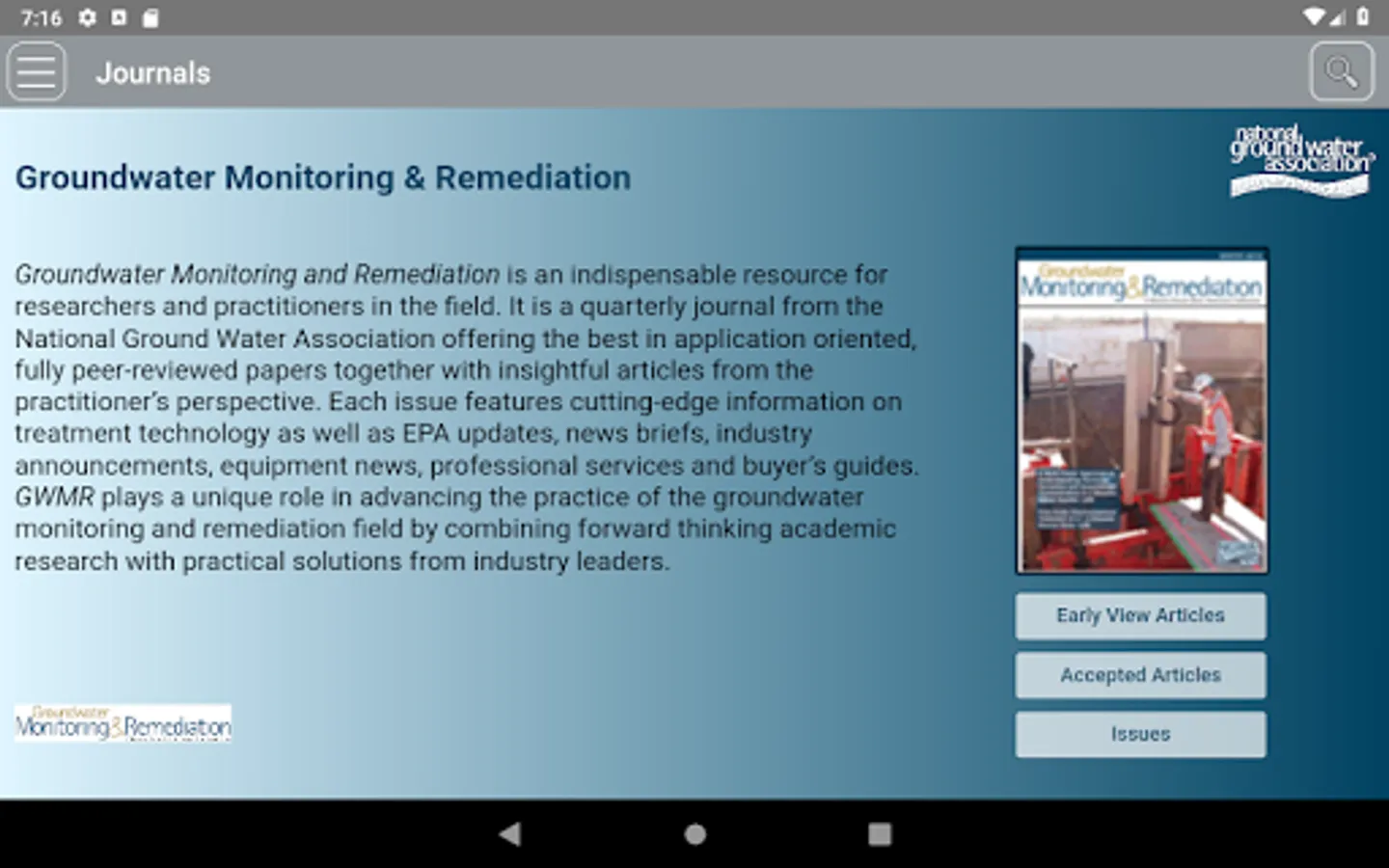 Groundwater Monitoring & Remediation, a leading ground water and hydrogeology journal, is now available on your Android device. Groundwater Monitoring & Remediation brings you a stimulating, high-impact mixture of Review Articles, Highlights, Communications, and more. Enjoy an entirely new browsing and reading experience, and keep up to date with the most important developments in chemical research even faster: