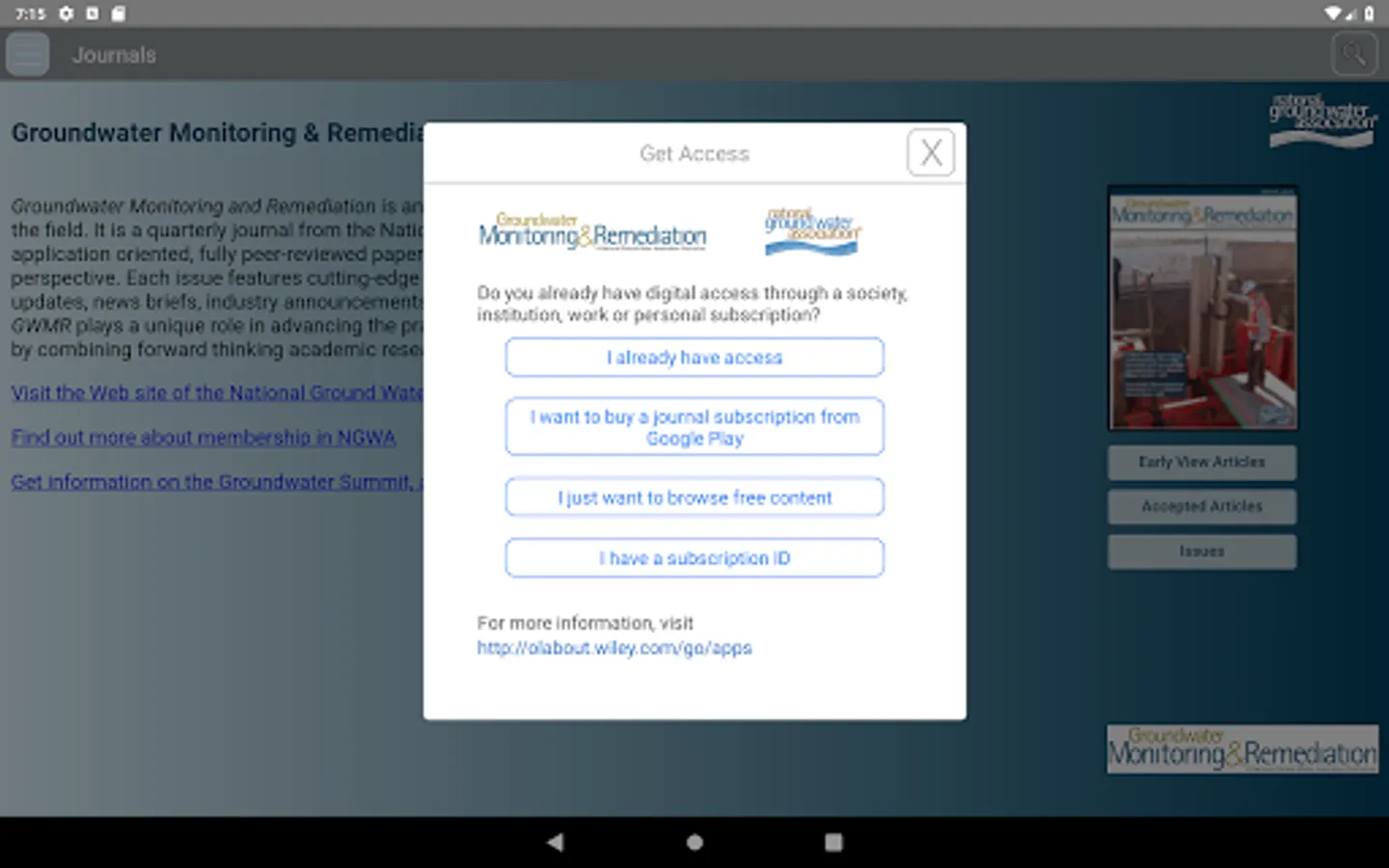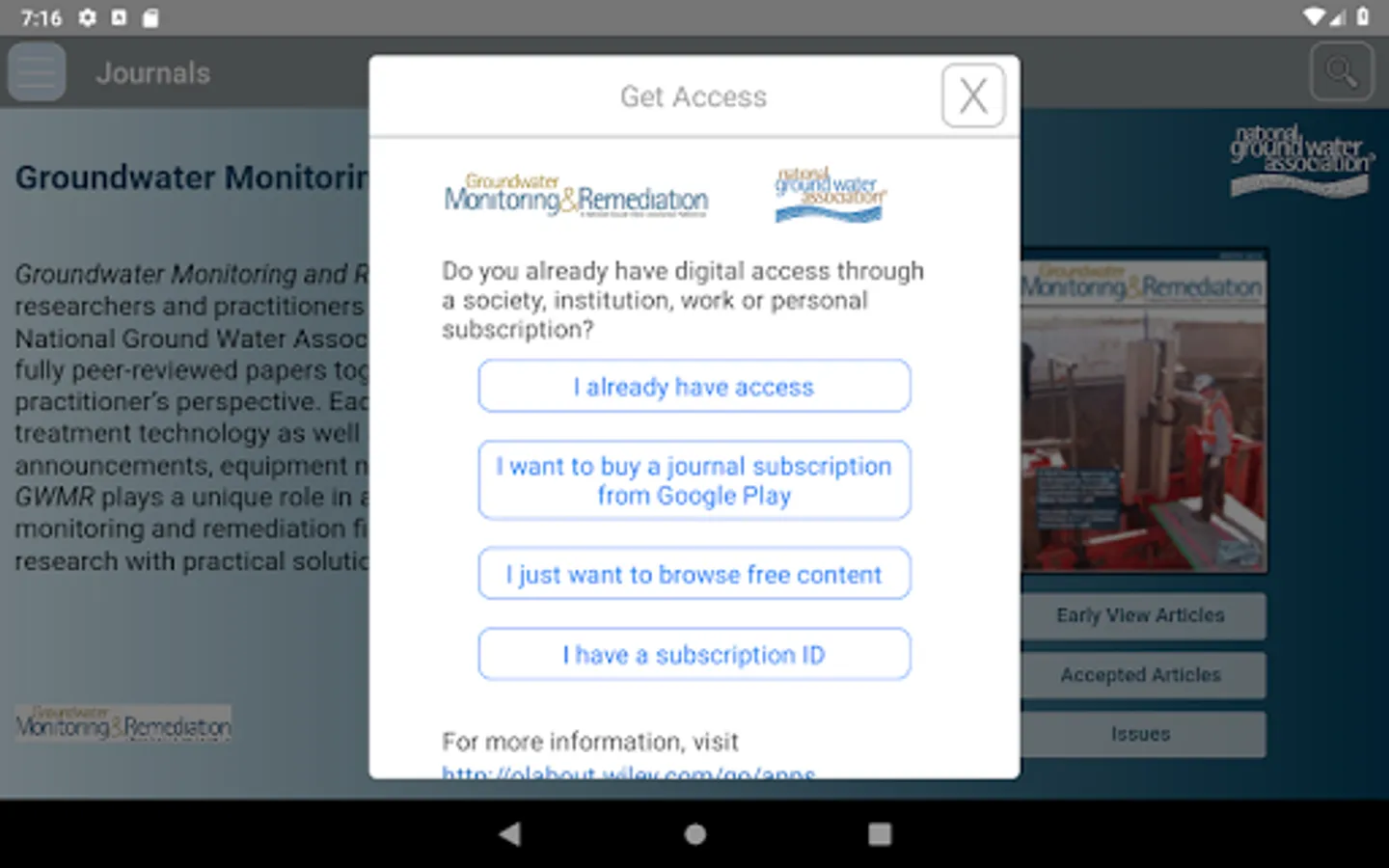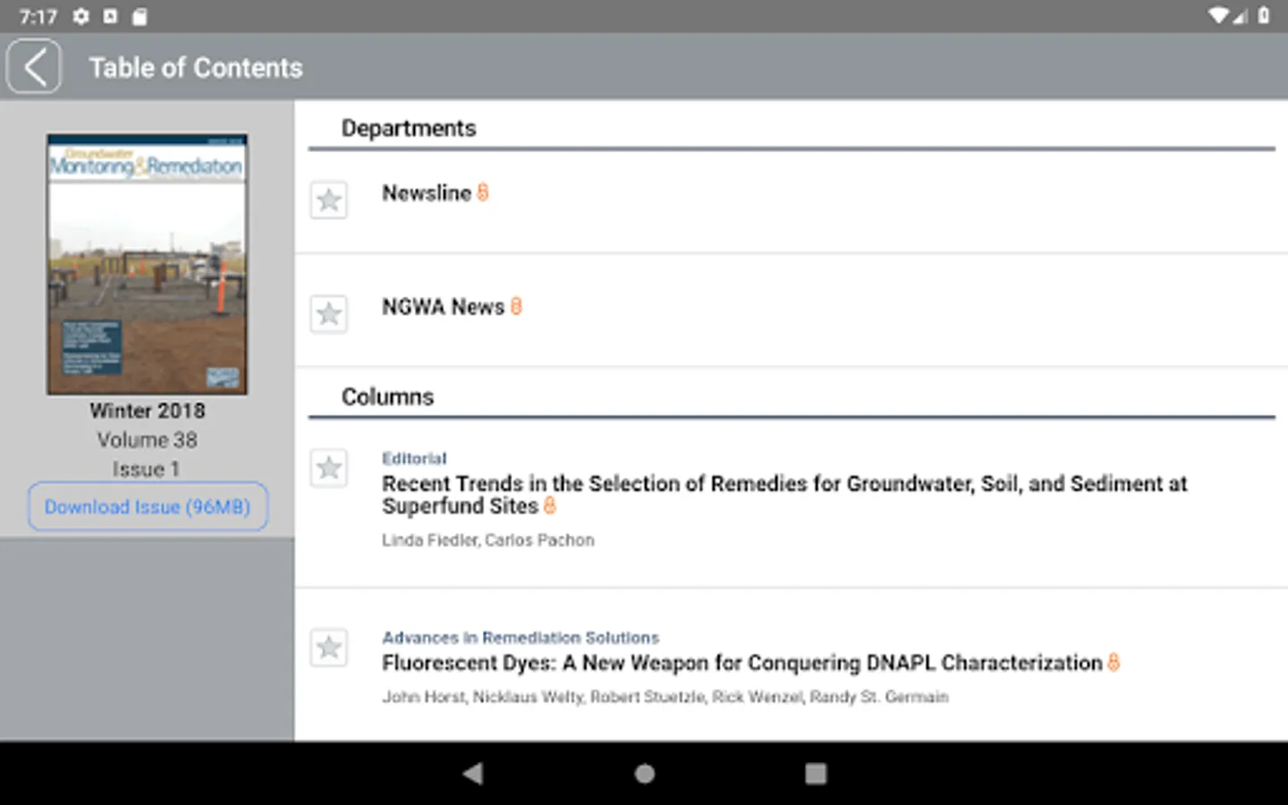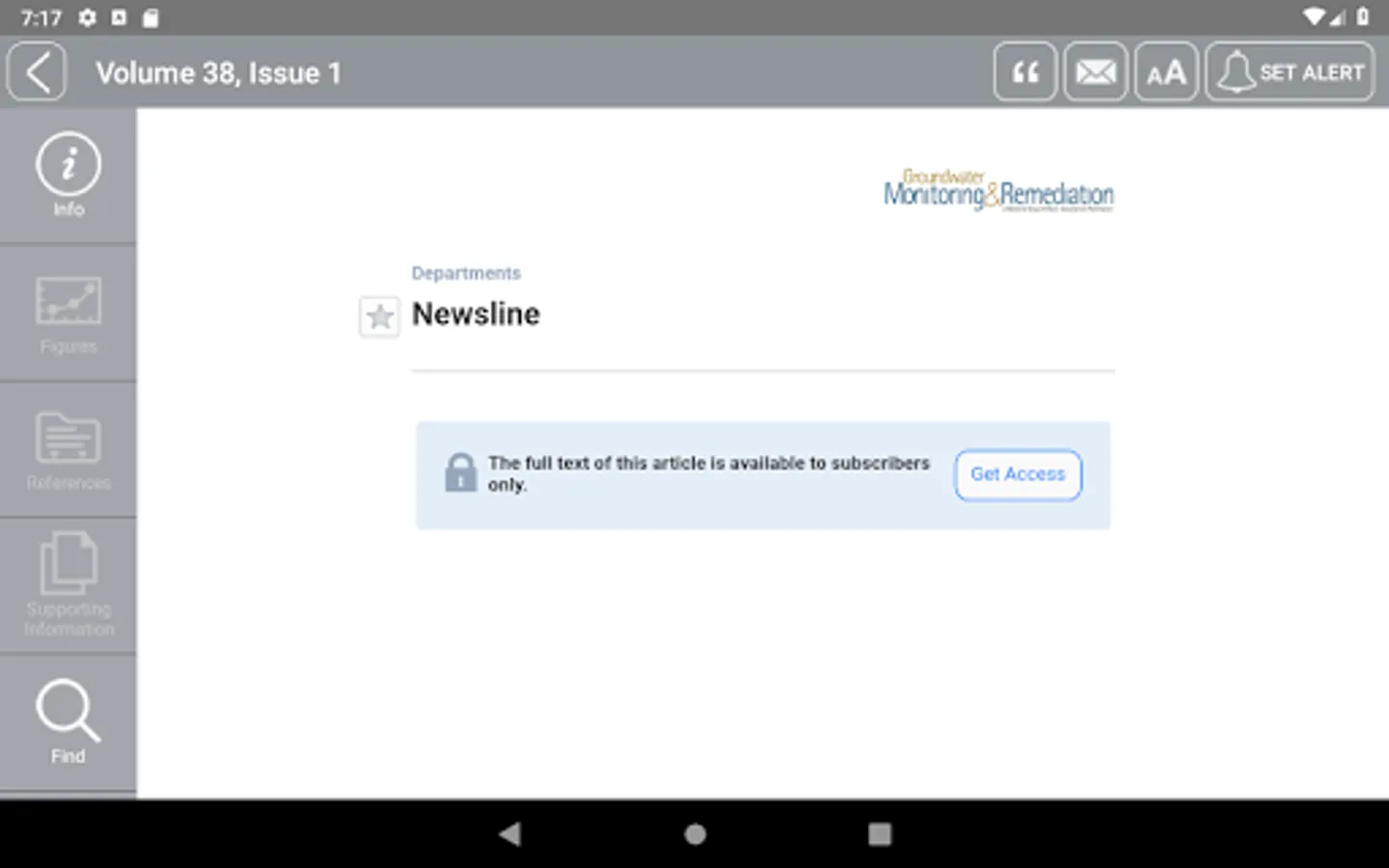 Groundwater Monitoring & Remediation, a leading ground water and hydrogeology journal, is now available on your Android device. Groundwater Monitoring & Remediation brings you a stimulating, high-impact mixture of Review Articles, Highlights, Communications, and more. Enjoy an entirely new browsing and reading experience, and keep up to date with the most important developments in chemical research even faster:
