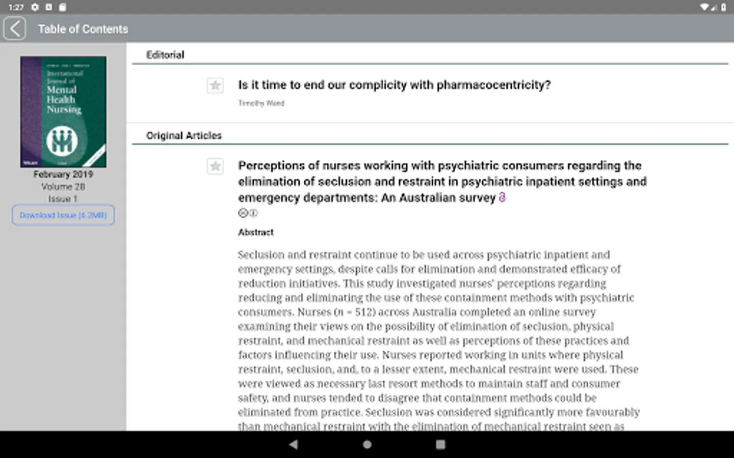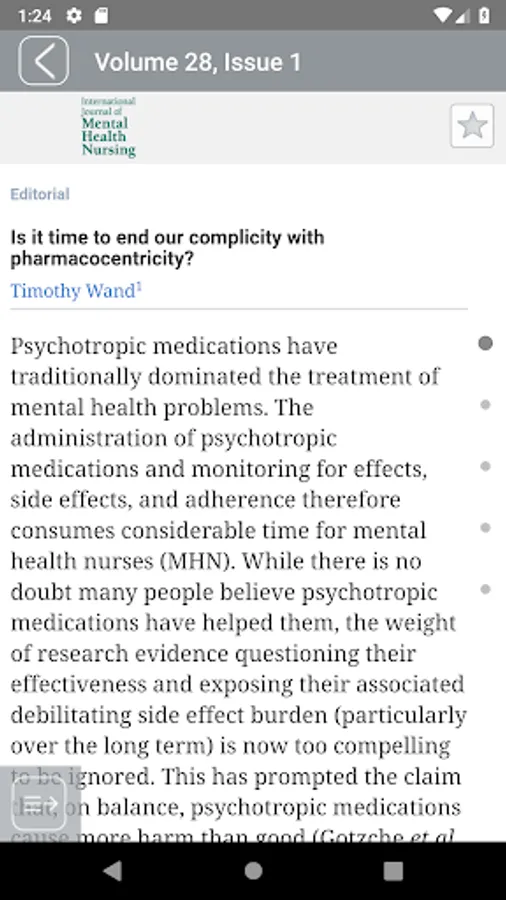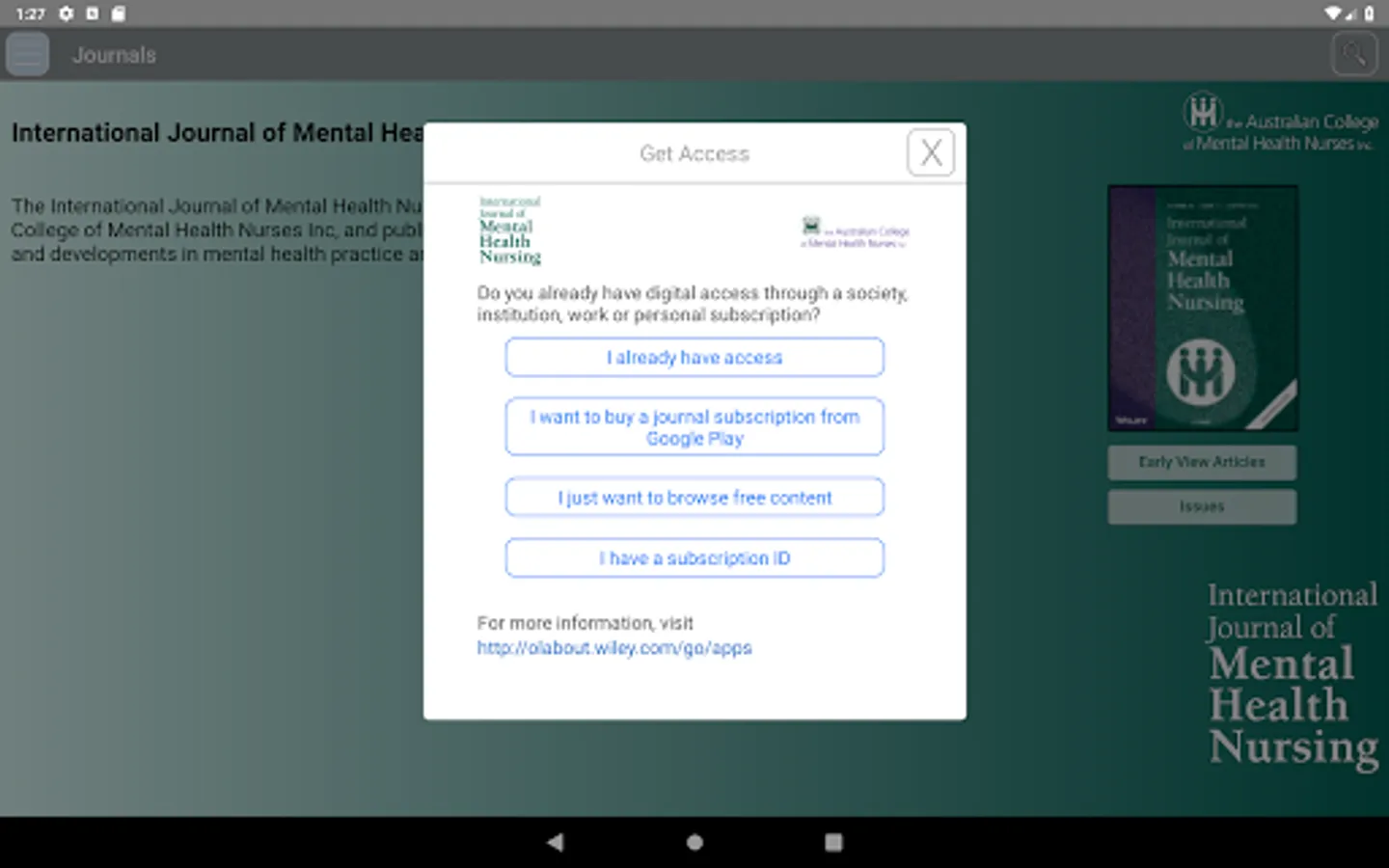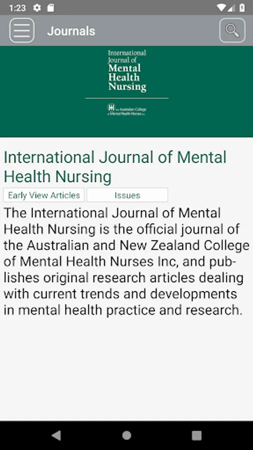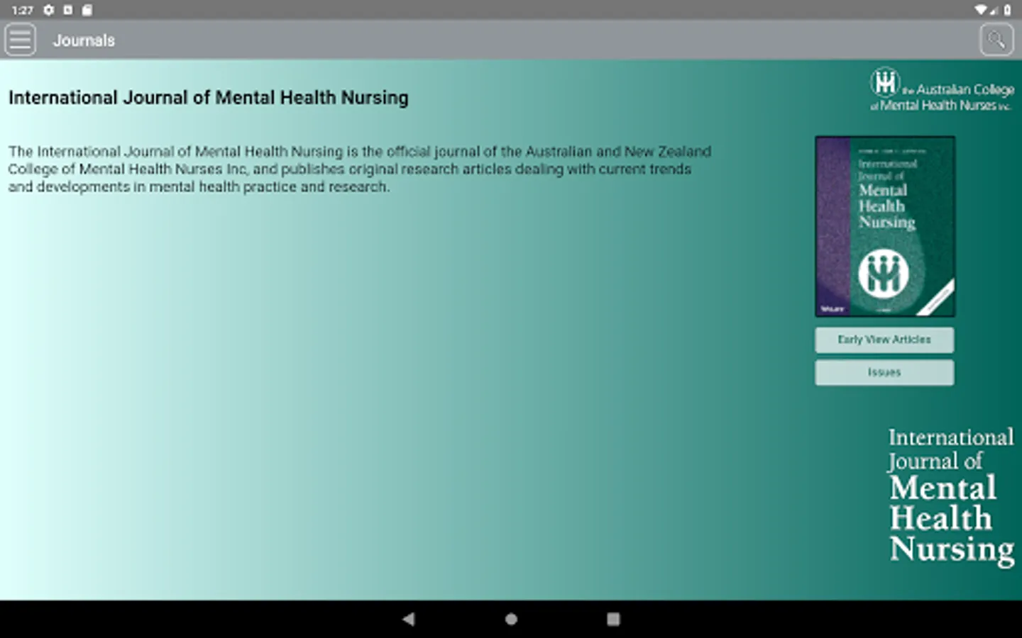 This is the app for the International Journal of Mental Health Nursing, a fully refereed journal examining current trends and developments in mental health practice and research. The Journal provides a lively forum for the exchange of ideas on all issues relevant to mental health nursing, including directions in education and training, management approaches, policy, ethical questions, theoretical inquiry and clinical concerns.